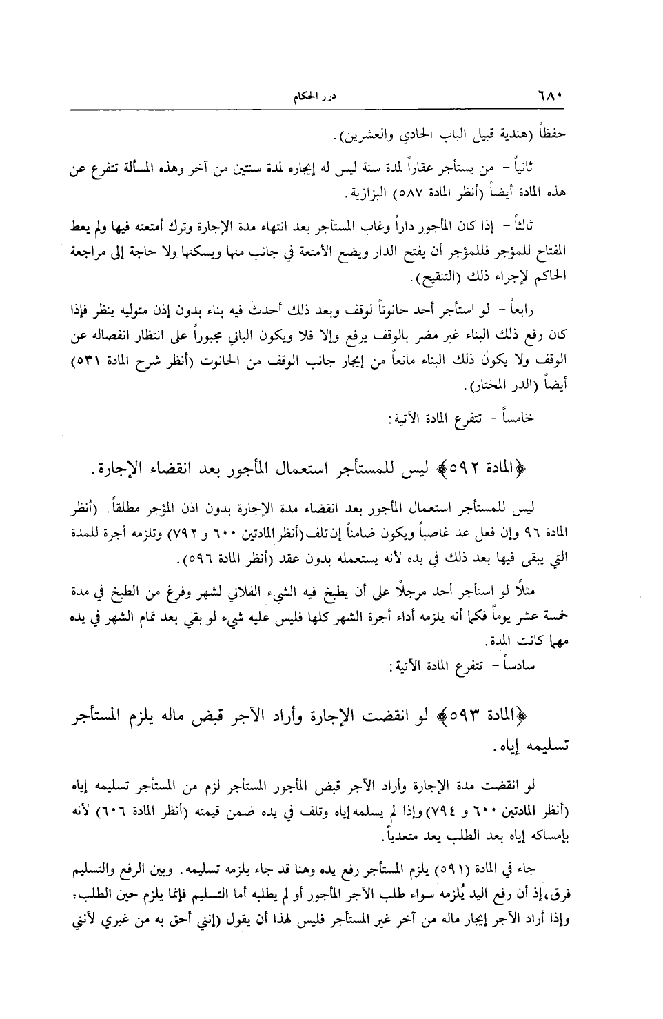 سَادِسًا - تَتَفَرَّعُ الْمَادَّةُ الْآتِيَةُ: (الْمَادَّةُ 593) لَوْ انْقَضَتْ الْإِجَارَةُ وَأَرَادَ الْآجِرُ قَبْضَ مَالِهِ يَلْزَمُ الْمُسْتَأْجِرَ تَسْلِيمُهُ إيَّاهُ. لَوْ انْقَضَتْ مُدَّةُ الْإِجَارَةِ وَأَرَادَ الْآجِرُ قَبْضَ الْمَأْجُورِ الْمُسْتَأْجَرِ لَزِمَ مِنْ الْمُسْتَأْجِرِ تَسْلِيمُهُ إيَّاهُ (اُنْظُرْ الْمَادَّتَيْنِ 600 و 794) وَإِذَا لَمْ يُسَلِّمْهُ إيَّاهُ وَتَلِفَ فِي يَدِهِ ضَمِنَ قِيمَتَهُ (اُنْظُرْ الْمَادَّةَ 606) لِأَنَّهُ بِإِمْسَاكِهِ إيَّاهُ بَعْدَ الطَّلَبِ يُعَدُّ مُتَعَدِّيًا. جَاءَ فِي الْمَادَّةِ (591) يَلْزَمُ الْمُسْتَأْجِرَ رَفْعُ يَدِهِ وَهُنَا قَدْ جَاءَ يَلْزَمُهُ تَسْلِيمُهُ. وَبَيْنَ الرَّفْعِ وَالتَّسْلِيمِ فَرْقٌ، إذْ أَنَّ رَفْعَ الْيَدِ يَلْزَمُهُ سَوَاءٌ طَلَبَ الْآجِرُ الْمَأْجُورَ أَوْ لَمْ يَطْلُبْهُ، أَمَّا التَّسْلِيمُ فَإِنَّمَا يَلْزَمُ حِينَ الطَّلَبِ، وَإِذَا أَرَادَ الْآجِرُ إيجَارَ مَالِهِ مِنْ آخَرَ غَيْرِ الْمُسْتَأْجِرِ، فَلَيْسَ لِهَذَا أَنْ يَقُولَ (إنَّنِي أَحَقُّ بِهِ مِنْ غَيْرِي؛ لِأَنَّنِي