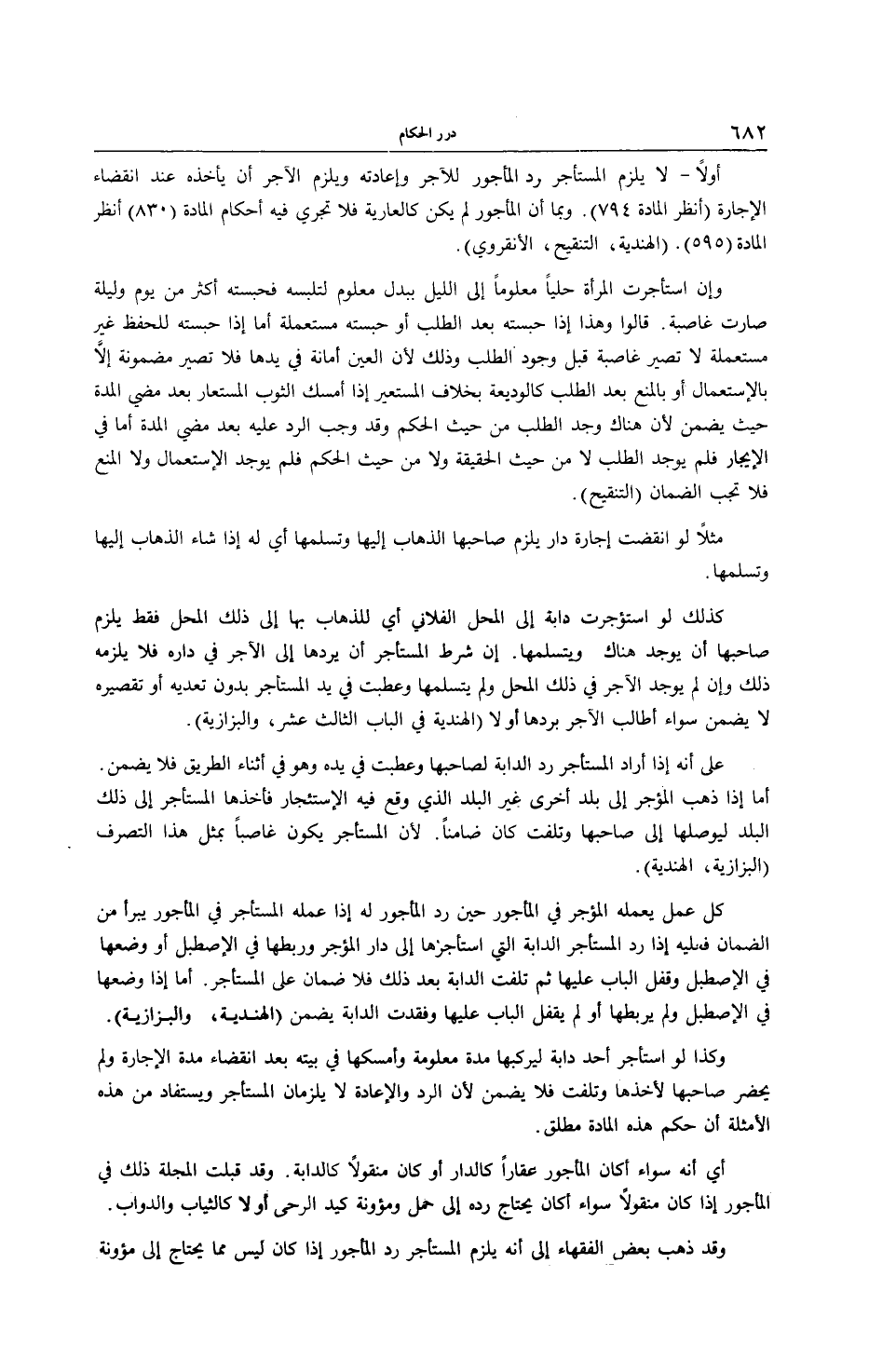 كُلُّ عَمَلٍ يَعْمَلُهُ الْمُؤَجِّرُ فِي الْمَأْجُورِ حِينَ رَدِّ الْمَأْجُورِ لَهُ إذَا عَمِلَهُ الْمُسْتَأْجِرُ فِي الْمَأْجُورِ يَبْرَأُ مِنْ الضَّمَانِ فَعَلَيْهِ إذَا رَدَّ الْمُسْتَأْجِرُ الدَّابَّةَ الَّتِي اسْتَأْجَرَهَا إلَى دَارِ الْمُؤَجِّرِ وَرَبَطَهَا فِي الْإِصْطَبْلِ أَوْ وَضَعَهَا فِي الْإِصْطَبْلِ وَقَفَلَ الْبَابَ عَلَيْهَا، ثُمَّ تَلِفَتْ الدَّابَّةُ بَعْدَ ذَلِكَ، فَلَا ضَمَانَ عَلَى الْمُسْتَأْجِرِ. أَمَّا إذَا وَضَعَهَا فِي الْإِصْطَبْلِ، وَلَمْ يَرْبِطْهَا أَوْ لَمْ يُقْفِلْ الْبَابَ عَلَيْهَا وَفُقِدَتْ الدَّابَّةُ يَضْمَنُ (الْهِنْدِيَّةُ، وَالْبَزَّازِيَّة) . وَكَذَا لَوْ اسْتَأْجَرَ أَحَدٌ دَابَّةً لِيَرْكَبَهَا مُدَّةً مَعْلُومَةً وَأَمْسَكَهَا فِي بَيْتِهِ بَعْدَ انْقِضَاءِ مُدَّةِ الْإِجَارَةِ، وَلَمْ يَحْضُرْ صَاحِبُهَا لِأَخْذِهَا وَتَلِفَتْ، فَلَا يَضْمَنُ؛ لِأَنَّ الرَّدَّ وَالْإِعَادَةَ لَا يَلْزَمَانِ الْمُسْتَأْجِرَ وَيُسْتَفَادُ مِنْ هَذِهِ الْأَمْثِلَةِ أَنَّ حُكْمَ هَذِهِ الْمَادَّةِ مُطْلَقٌ. أَيْ إنَّهُ سَوَاءٌ أَكَانَ الْمَأْجُورُ عَقَارًا كَالدَّارِ أَوْ كَانَ مَنْقُولًا كَالدَّابَّةِ. وَقَدْ قَبِلَتْ الْمَجَلَّةُ ذَلِكَ فِي الْمَأْجُورِ إذَا كَانَ مَنْقُولًا سَوَاءٌ أَكَانَ يَحْتَاجُ رَدُّهُ إلَى حَمْلٍ وَمَئُونَةٍ كَيَدِ الرَّحَى أَوْ لَا كَالثِّيَابِ وَالدَّوَابِّ. وَقَدْ ذَهَبَ بَعْضُ الْفُقَهَاءِ إلَى أَنَّهُ يَلْزَمُ الْمُسْتَأْجِرَ رَدُّ الْمَأْجُورِ إذَا كَانَ لَيْسَ مِمَّا يَحْتَاجُ إلَى مَئُونَةٍ