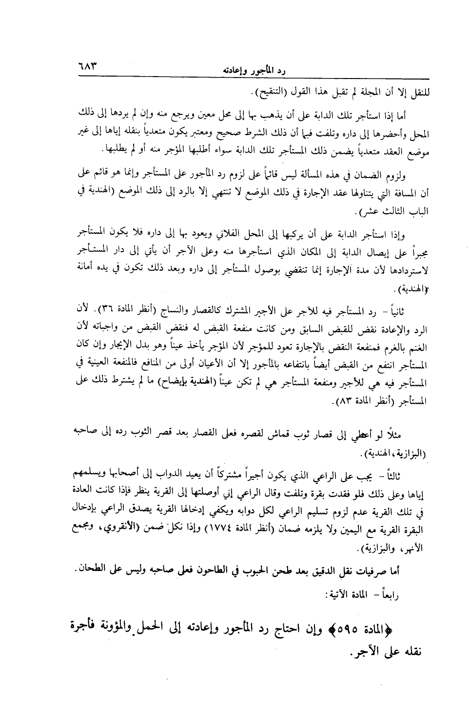رَابِعًا - الْمَادَّةُ الْآتِيَةُ: (الْمَادَّةُ 595) احْتَاجَ رَدُّ الْمَأْجُورِ وَإِعَادَتُهُ إلَى الْحَمْلِ وَالْمَئُونَةِ فَأُجْرَةُ نَقْلِهِ عَلَى الْآجِرِ.