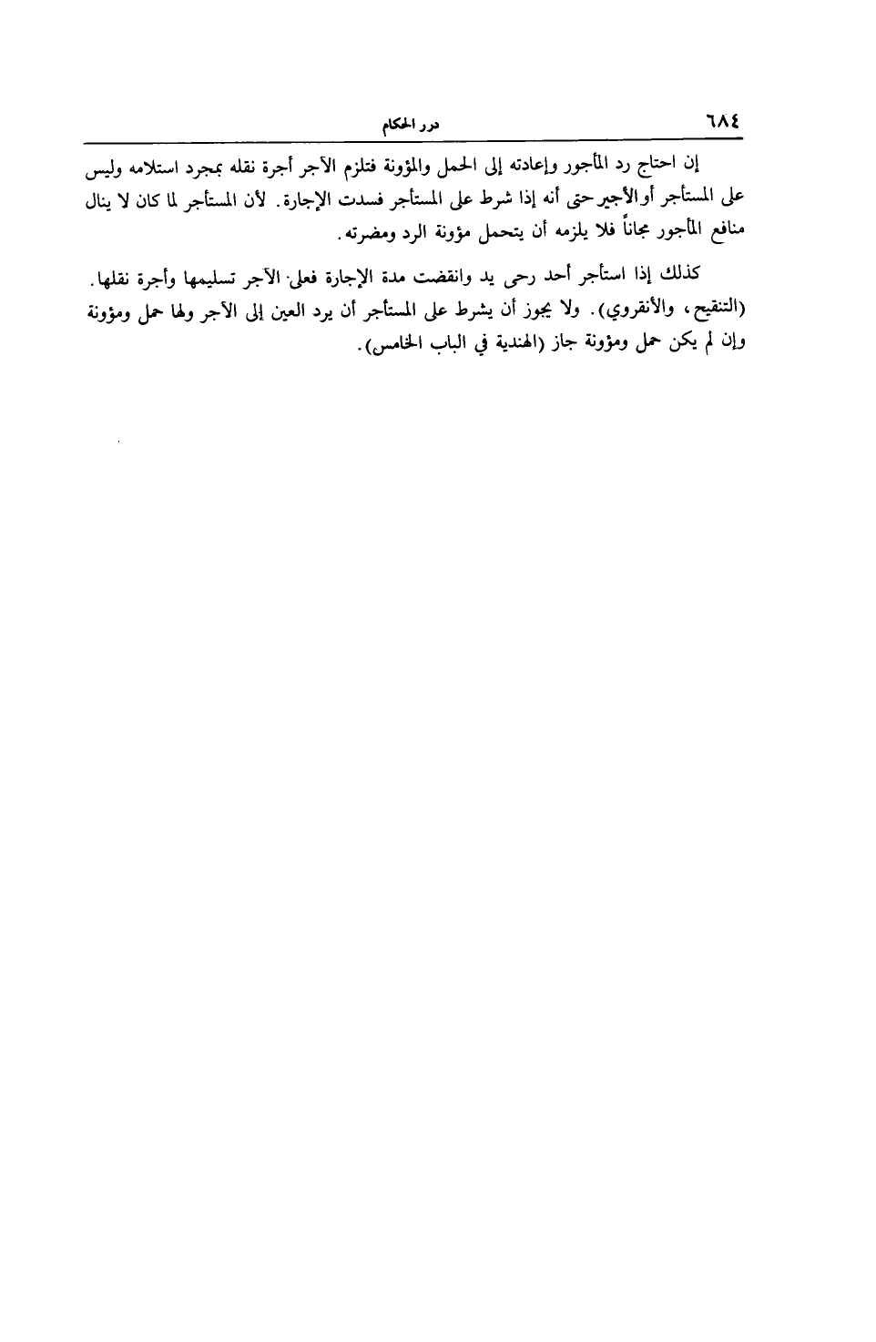 إنْ احْتَاجَ رَدُّ الْمَأْجُورِ وَإِعَادَتُهُ إلَى الْحَمْلِ وَالْمَئُونَةِ فَتَلْزَمُ الْآجِرَ أُجْرَةُ نَقْلِهِ بِمُجَرَّدِ اسْتِلَامِهِ، وَلَيْسَ عَلَى الْمُسْتَأْجِرِ أَوْ الْأَجِيرِ حَتَّى إنَّهُ إذَا شُرِطَ عَلَى الْمُسْتَأْجِرِ فَسَدَتْ الْإِجَارَةُ؛ لِأَنَّ الْمُسْتَأْجِرَ لَمَّا كَانَ لَا يَنَالُ مَنَافِعَ الْمَأْجُورِ مَجَّانًا، فَلَا يَلْزَمُهُ أَنْ يَتَحَمَّلَ مَئُونَةَ الرَّدِّ وَمَضَرَّتَهُ. كَذَلِكَ إذَا اسْتَأْجَرَ أَحَدٌ رَحَى يَدٍ وَانْقَضَتْ مُدَّةُ الْإِجَارَةِ، فَعَلَى الْآجِرِ تَسْلِيمُهَا وَأُجْرَةُ نَقْلِهَا. (التَّنْقِيحُ، وَالْأَنْقِرْوِيّ) . وَلَا يَجُوزُ أَنْ يُشْرَطَ عَلَى الْمُسْتَأْجِرِ أَنْ يَرُدَّ الْعَيْنَ إلَى الْآجِرِ وَلَهَا حَمْلٌ وَمَئُونَةٌ، وَإِنْ لَمْ يَكُنْ حَمْلٌ وَمَئُونَةٌ جَازَ (الْهِنْدِيَّةُ فِي الْبَاب الْخَامِسِ)