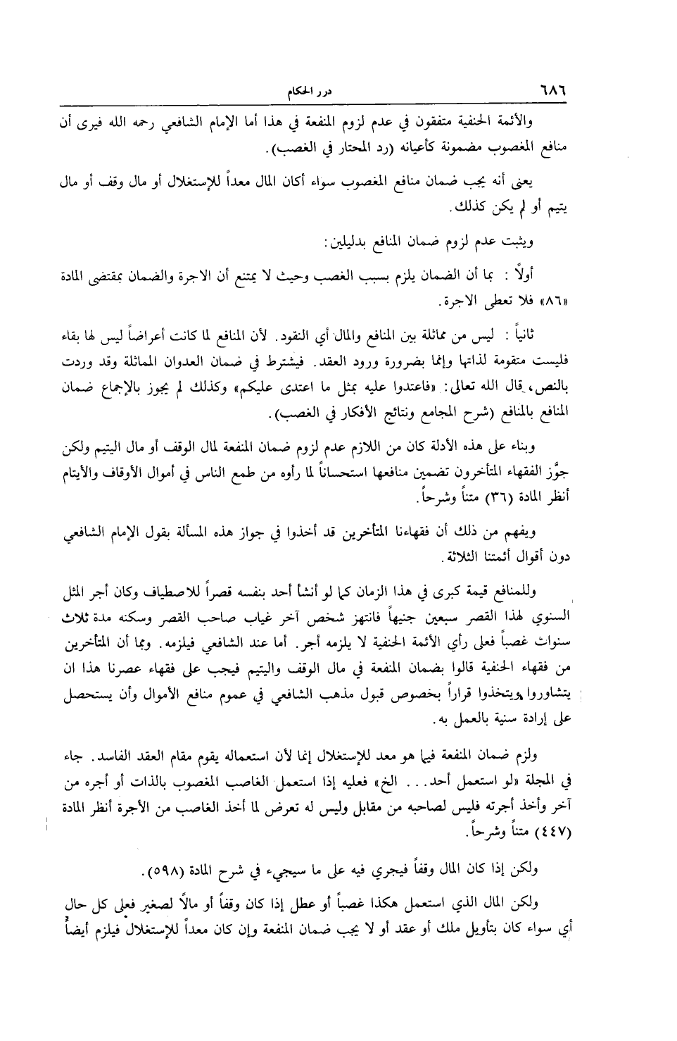 وَيُفْهَمُ مِنْ ذَلِكَ أَنَّ فُقَهَاءَنَا الْمُتَأَخِّرِينَ قَدْ أَخَذُوا فِي جَوَازِ هَذِهِ الْمَسْأَلَةِ بِقَوْلِ الْإِمَامِ الشَّافِعِيِّ دُونَ أَقْوَالِ أَئِمَّتِنَا الثَّلَاثَةِ وَلِلْمَنَافِعِ قِيمَةٌ كُبْرَى فِي هَذَا الزَّمَانِ، كَمَا لَوْ أَنْشَأَ أَحَدٌ بِنَفْسِهِ قَصْرًا لِلِاصْطِيَافِ وَكَانَ أَجْرُ الْمِثْلِ السَّنَوِيِّ لِهَذَا الْقَصْرِ سَبْعِينَ جُنَيْهًا فَانْتَهَزَ شَخْصٌ آخَرَ غِيَابَ صَاحِبِ الْقَصْرِ وَسَكَنَهُ مُدَّةَ ثَلَاثِ سَنَوَاتٍ غَصْبًا، فَعَلَى رَأْيِ الْأَئِمَّةِ الْحَنَفِيَّةِ لَا يَلْزَمُهُ أَجْرٌ. أَمَّا عِنْدَ الشَّافِعِيِّ فَيَلْزَمُهُ، وَبِمَا أَنَّ الْمُتَأَخِّرِينَ مِنْ فُقَهَاءِ الْحَنَفِيَّةِ قَالُوا بِضَمَانِ الْمَنْفَعَةِ فِي مَالِ الْوَقْفِ وَالْيَتِيمِ فَيَجِبُ عَلَى فُقَهَاءِ عَصْرِنَا هَذَا أَنْ يَتَشَاوَرُوا وَيَتَّخِذُوا قَرَارًا بِخُصُوصِ قَبُولِ مَذْهَبِ الشَّافِعِيِّ فِي عُمُومِ مَنَافِعِ الْأَمْوَالِ وَأَنْ يُسْتَحْصَلَ عَلَى إرَادَةٍ سُنِّيَّةٍ بِالْعَمَلِ بِهِ. وَلَزِمَ ضَمَانُ الْمَنْفَعَةِ فِيمَا هُوَ مُعَدٌّ لِلِاسْتِغْلَالِ إنَّمَا لِأَنَّ اسْتِعْمَالَهُ يَقُومُ مَقَامَ الْعَقْدِ الْفَاسِدِ.