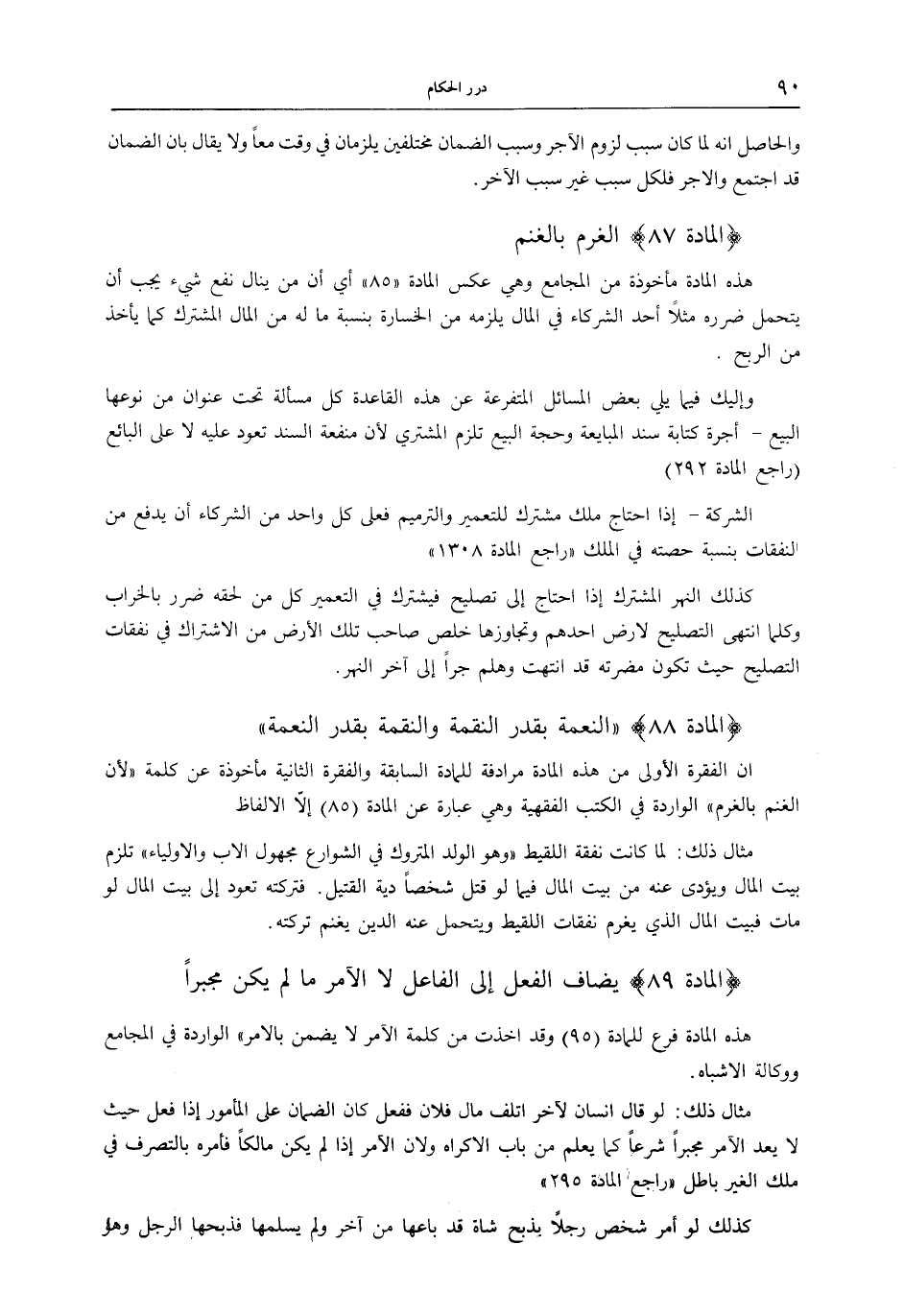 الْغُرْمُ بِالْغُنْمِ هَذِهِ الْمَادَّةُ مَأْخُوذَةٌ مِنْ الْمَجَامِع وَهِيَ عَكْسُ الْمَادَّةِ (85) أَيْ أَنَّ مَنْ يَنَالَ نَفْعَ شَيْءٍ يَجِبُ أَنْ يَتَحَمَّلَ ضَرَرَهُ مَثَلًا أَحَدُ الشُّرَكَاءِ فِي الْمَالِ يَلْزَمُهُ مِنْ الْخَسَارَةِ بِنِسْبَةِ مَا لَهُ مِنْ الْمَالِ الْمُشْتَرَكِ كَمَا يَأْخُذُ مِنْ الرِّبْحِ.