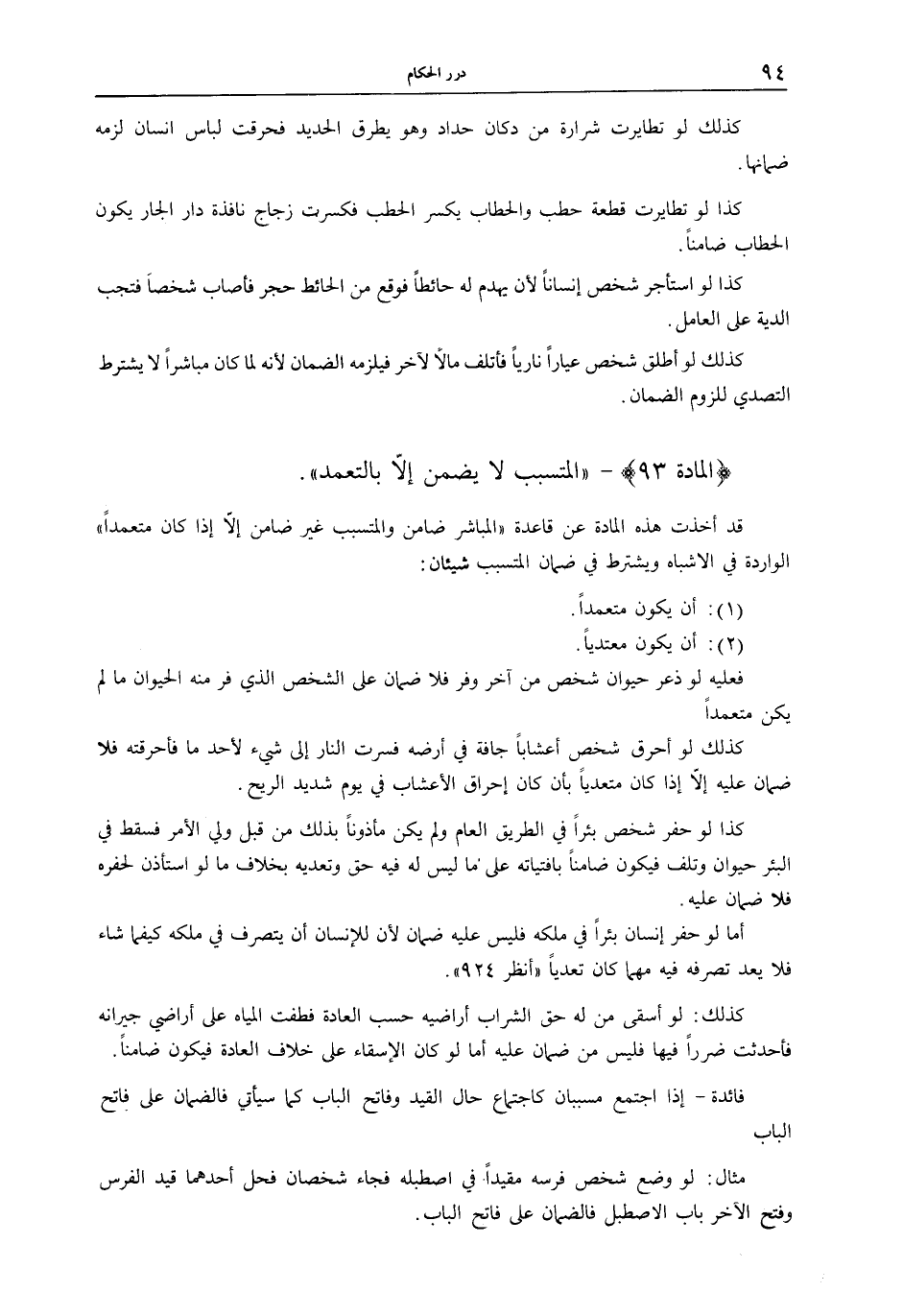 (الْمَادَّةُ 93) - (الْمُتَسَبِّبُ لَا يَضْمَنُ إلَّا بِالتَّعَمُّدِ) قَدْ أُخِذَتْ هَذِهِ الْمَادَّةُ عَنْ قَاعِدَةِ (الْمُبَاشِرُ ضَامِنٌ وَالْمُتَسَبِّبُ غَيْرُ ضَامِنٍ إلَّا إذَا كَانَ مُتَعَمِّدًا) الْوَارِدَةِ فِي الْأَشْبَاهِ وَيُشْتَرَطُ فِي ضَمَانِ الْمُتَسَبِّبِ شَيْئَانِ: (1) : أَنْ يَكُونَ مُتَعَمِّدًا.