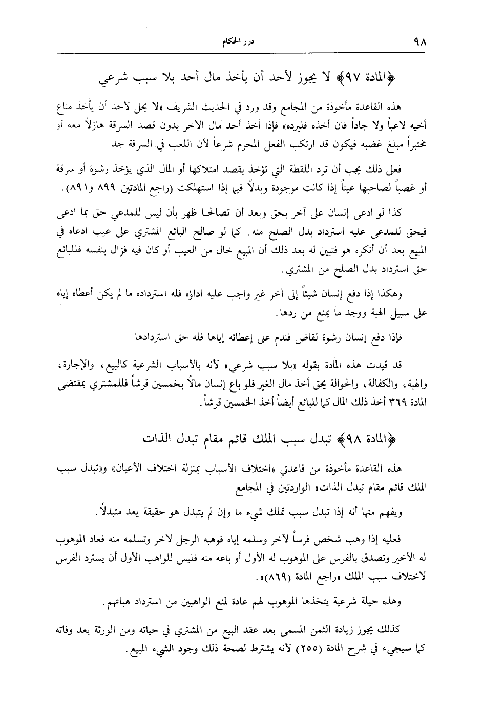 [ (الْمَادَّةُ 97) لَا يَجُوزُ لِأَحَدٍ أَنْ يَأْخُذَ مَالَ أَحَدٍ بِلَا سَبَبٍ شَرْعِيٍّ]