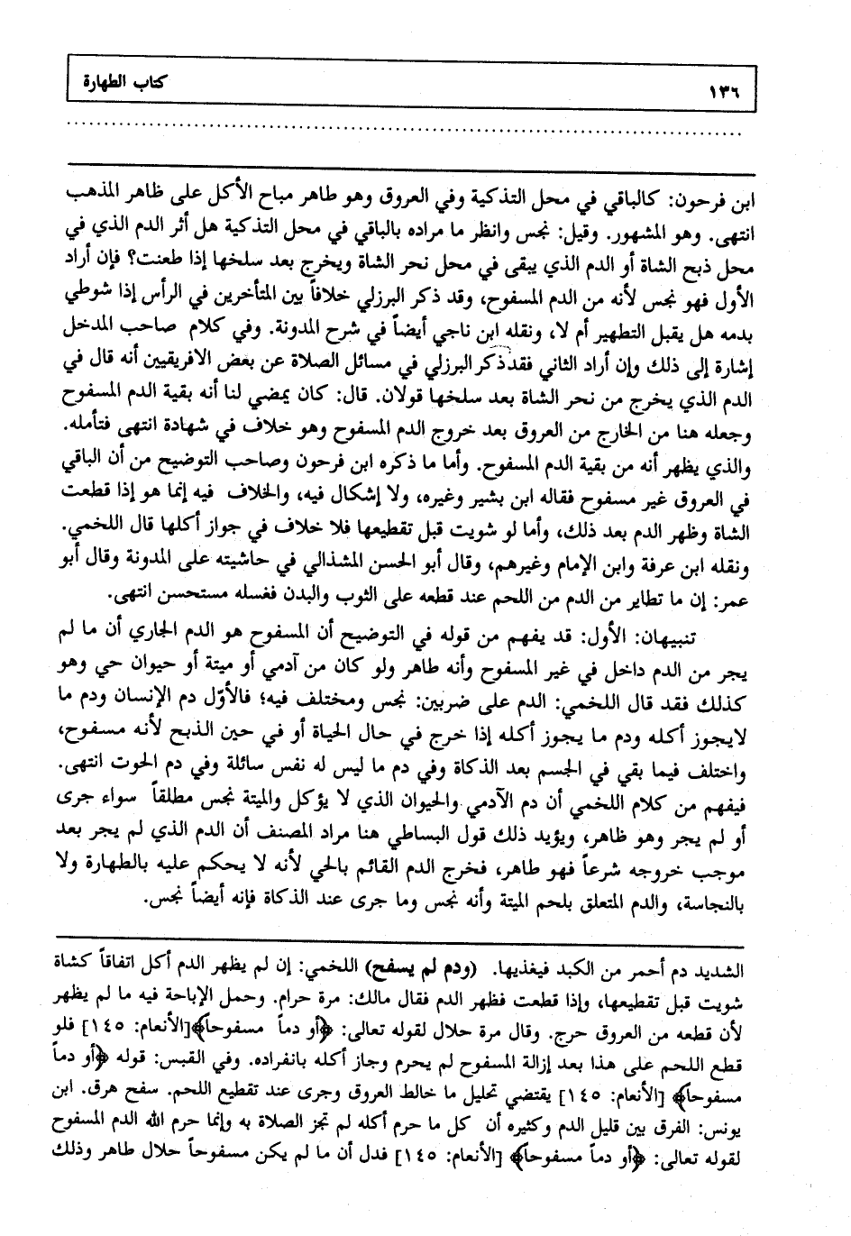 ابن فرحون: كالباقي في محل التذكية وفي العروق وهو طاهر مباح الأكل على ظاهر المذهب انتهى. وهو المشهور وقيل نجس وانظر ما مراده بالباقي في محل التذكية هل أثر الدم الذي في محل ذبح الشاة أو الدم الذي يبقى في محل نحر الشاة ويخرج بعد سلخها إذا طعنت فإن أراد الأول فهو نجس لأنه من الدم المسفوح وقد ذكر البرزلي خلافا بين المتأخرين في الرأس إذا شوطي بدمه هل يقبل التطهير أم لا ونقله ابن ناجي أيضا في شرح المدونة وفي كلام صاحب المدخل إشارة إلى ذلك وإن أراد الثاني فقد ذكر البرزلي في مسائل الصلاة عن بعض الإفريقيين أنه قال في الدم الذي يخرج من نحر الشاة بعد سلخها قولان قال كان يمضي لنا أنه بقية الدم المسفوح وجعله هنا من الخارج من العروق بعد خروج الدم المسفوح وهو خلاف في شهادة انتهى. فتأمله والذي يظهر أنه من بقية الدم المسفوح وأما ما ذكره ابن فرحون وصاحب التوضيح من أن الباقي في العروق غير مسفوح فقاله ابن بشير وغيره ولا إشكال فيه والخلاف فيه إنما هو إذا قطعت الشاة وظهر الدم بعد ذلك وأما لو شويت قبل تقطيعها فلا خلاف في جواز أكلها قال اللخمي: ونقله ابن عرفة وابن الإمام وغيرهم وقال أبو الحسن المشذالي في حاشيته على المدونة وقال أبو عمر: إن ما تطاير من الدم من اللحم عند قطعه على الثوب والبدن فغسله مستحسن انتهى.