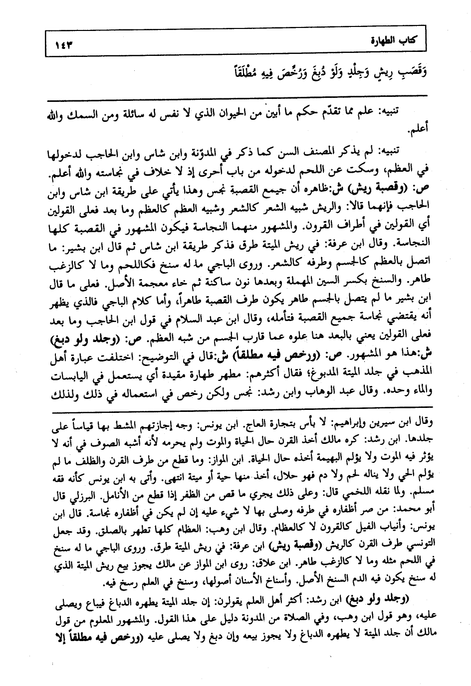 تنبيه : لم يذكر المصنف السن كما ذكر في المدونة وابن شاس وابن الحاجب لدخولها في العظم وسكت عن اللحم لدخوله من باب أحرى إذ لا خلاف في نجاسته والله أعلم. ص: "وقصبة ريش" ش: ظاهره أن جميع القصبة نجس وهذا يأتي على طريقة ابن شاس وابن الحاجب فإنهما قالا والريش شبيه الشعر كالشعر وشبيه العظم كالعظم وما بعد فعلى القولين أي القولين في أطراف القرون والمشهور منهما النجاسة فيكون المشهور في القصبة كلها النجاسة وقال ابن عرفة: في ريش الميتة طرق فذكر طريقة ابن شاس ثم قال ابن بشير: ما اتصل بالعظم كالجسم وطرفه كالشعر وروى الباجي ما له سنخ فكاللحم وما لا كالزغب طاهر والسنخ بكسر السين المهملة وبعدها نون ساكنة ثم خاء معجمة الأصل فعلى ما قال ابن بشير: ما لم يتصل بالجسم طاهر يكون طرف القصبة طاهرا وأما كلام الباجي فالذي يظهر أنه يقتضي نجاسة جميع القصبة فتأمله وقال ابن عبد السلام في قول ابن الحاجب: "وما بعد فعلى القولين": يعني بالبعد هنا علوه عما قارب الجسم من شبه العظم ص: "وجلد ولو دبغ" ش: هذا هو المشهور ص: "ورخص فيه مطلقا" ش: قال في التوضيح: اختلفت عبارة أهل المذهب في جلد الميتة المدبوغ فقال أكثرهم مطهر طهارة مقيدة أي يستعمل في اليابسات والماء وحده وقال عبد الوهاب وابن رشد: نجس ولكن رخص في استعماله في ذلك ولذلك