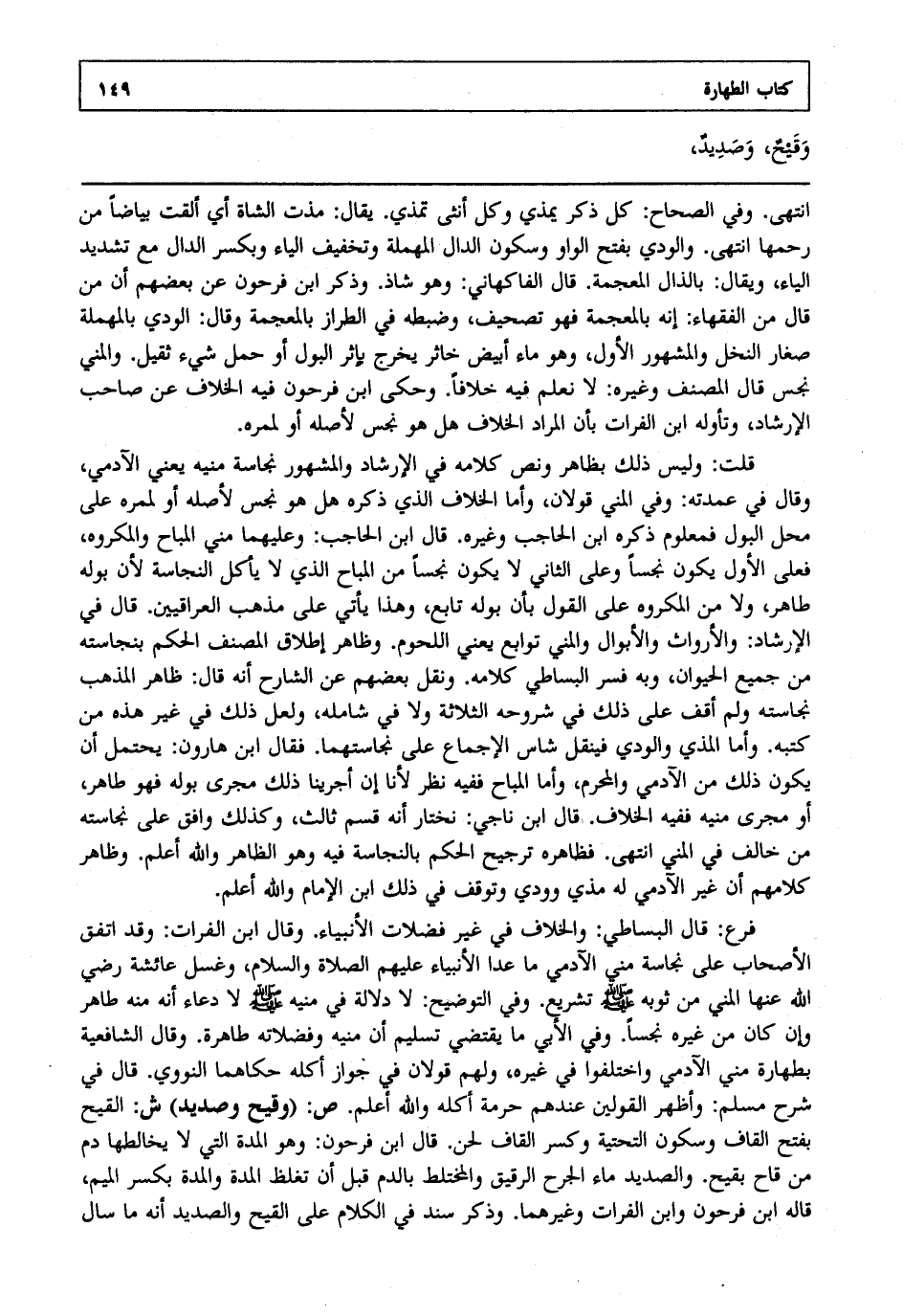 قلت: وليس ذلك بظاهر ونص كلامه في الإرشاد والمشهور نجاسة منيه يعني الآدمي وقال في عمدته وفي المني قولان وأما الخلاف الذي ذكره هل هو نجس لأصله أو لممره على محل البول فمعلوم ذكره ابن الحاجب وغيره قال ابن الحاجب وعليهما مني المباح والمكروه فعلى الأول يكون نجسا وعلى الثاني لا يكون نجسا من المباح الذي لا يأكل النجاسة لأن بوله طاهر ولا من المكروه على القول بأن بوله تابع وهذا يأتي على مذهب العراقيين قال في الإرشاد والأرواث والأبوال والمني توابع يعني اللحوم وظاهر إطلاق المصنف الحكم بنجاسته من جميع الحيوان وبه فسر البساطي كلامه ونقل بعضهم عن الشارح أنه قال ظاهر المذهب نجاسته ولم أقف على ذلك في شروحه الثلاثة ولا في شامله ولعل ذلك في غير هذه من كتبه وأما المذي والودي فينقل شاس الإجماع على نجاستهما فقال ابن هارون: يحتمل أن يكون ذلك من الآدمي والمحرم وأما المباح ففيه نظر لأنا إن أجرينا ذلك مجرى بوله فهو طاهر أو مجرى منيه ففيه الخلاف قال ابن ناجي: نختار أنه قسم ثالث وكذلك وافق على نجاسته من خالف في المني انتهى. فظاهره ترجيح الحكم بالنجاسة فيه وهو الظاهر والله أعلم. وظاهر كلامهم أن غير الآدمي له مذي وودي وتوقف في ذلك ابن الإمام والله أعلم.