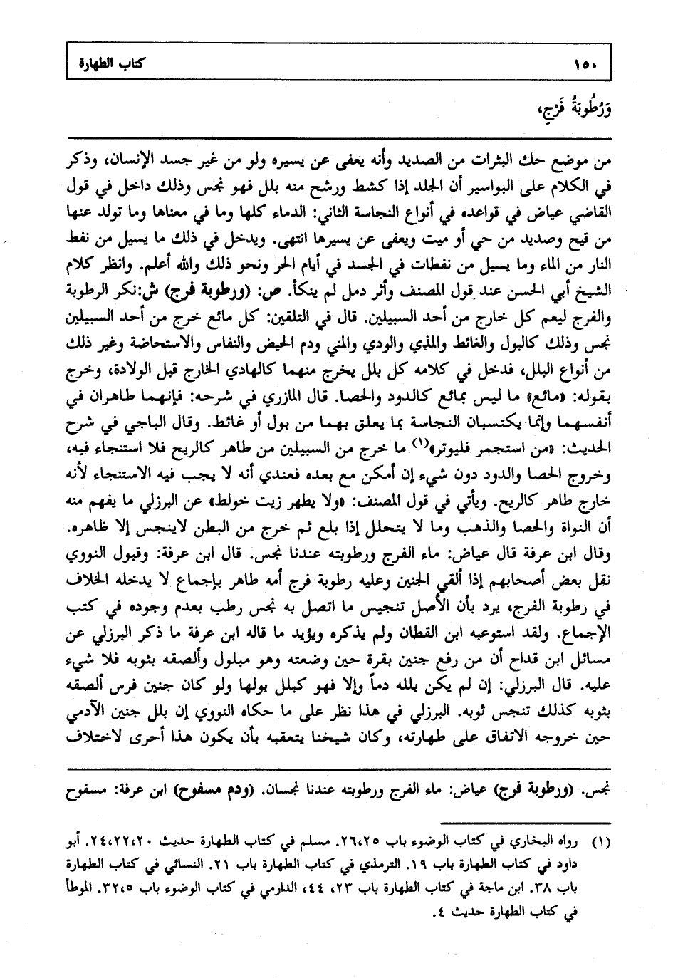 من موضع حك البثرات من الصديد وأنه يعفى عن يسيره ولو من غير جسد الإنسان وذكر في الكلام على البواسير أن الجلد إذا كشط ورشح منه بلل فهو نجس وذلك داخل في قول القاضي عياض في قواعده في أنواع النجاسة الثاني الدماء كلها وما في معناها وما تولد عنها من قيح وصديد من حي أو ميت ويعفى عن يسيرها انتهى. ويدخل في ذلك ما يسيل من نفط النار من الماء وما يسيل من نفطات في الجسد في أيام الحر ونحو ذلك والله أعلم. وانظر كلام الشيخ أبي الحسن عند قول المصنف وأثر دمل لم ينكأ ص: "ورطوبة فرج" ش: نكر الرطوبة والفرج ليعم كل خارج من أحد السبيلين قال في التلقين كل مائع خرج من أحد السبيلين نجس وذلك كالبول والغائط والمذي والودي والمني ودم الحيض والنفاس والاستحاضة وغير ذلك من أنواع البلل فدخل في كلامه كل بلل يخرج منهما كالهادي الخارج قبل الولادة وخرج بقوله مائع ما ليس بمائع كالدود والحصا قال المازري في شرحه فإنهما طاهران في أنفسهما وإنما يكتسبان النجاسة بما يعلق بهما من بول أو غائط وقال الباجي في شرح الحديث: "من استجمر فليوتر" 1 ما خرج من السبيلين من طاهر كالريح فلا استنجاء فيه وخروج الحصا والدود دون شيء إن أمكن مع بعده فعندي أنه لا يجب فيه الاستنجاء لأنه خارج طاهر كالريح ويأتي في قول المصنف ولا يطهر زيت خولط عن البرزلي ما يفهم منه أن النواة والحصا والذهب وما لا يتحلل إذا بلع ثم خرج من البطن لاينجس إلا ظاهره وقال ابن عرفة: قال عياض ماء الفرج ورطوبته عندنا نجس قال ابن عرفة: وقبول النووي نقل بعض أصحابهم إذا ألقي الجنين وعليه رطوبة فرج أمه طاهر بإجماع لا يدخله الخلاف في رطوبة الفرج يرد بأن الأصل تنجيس ما اتصل به نجس رطب بعدم وجوده في كتب الإجماع ولقد استوعبه ابن القطان ولم يذكره ويؤيد ما قاله ابن عرفة ما ذكر البرزلي عن مسائل ابن قداح أن من رفع جنين بقرة حين وضعته وهو مبلول وألصقه بثوبه فلا شيء عليه قال البرزلي إن لم يكن بلله دما وإلا فهو كبلل بولها ولو كان جنين فرس ألصقه بثوبه كذلك تنجس ثوبه البرزلي في هذا نظر على ما حكاه النووي إن بلل جنين الآدمي حين خروجه الاتفاق على طهارته وكان شيخنا يتعقبه بأن يكون هذا أحرى لاختلاف