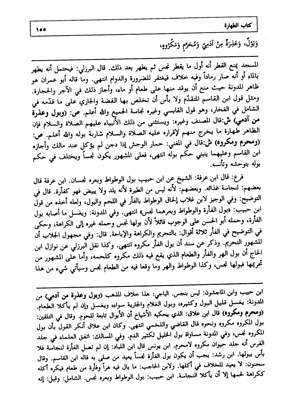 المسجد يمنع القطر أنه أول ما يقطر نجس ثم يطهر بعد ذلك قال البرزلي فيحتمل أنه يطهر بالماء أو أنه صار رمادا وفيه خلاف فيغتفر للضرورة والدوام انتهى. وما قاله أبو عمران هو ظاهر المدونة حيث منع أن يوقد منها على طعام أو ماء وأجاز ذلك في الآجر والحجارة ومثل قول ابن القاسم المتقدم ولا بأس أن تخلص بها الفضة والجاري على ما قدمه في الشامل في الفخار وهو قول القابسي وغيره نجاسة الجميع والله أعلم. ص: "وبول وعذرة من آدمي" ش: قال المصنف وغيره ويستثنى من ذلك الأنبياء عليهم الصلاة والسلام فإن الظاهر طهارة ما يخرج منهم لإقراره عليه الصلاة والسلام شاربة بوله والله أعلم. ص: "ومحرم ومكروه" ش: قال في المغني حمار الوحش إذا دجن لم يؤكل عند مالك وأجازه ابن القاسم وعليهما ينبني حكم بوله انتهى. فعلى المشهور يكون نجسا ويختلف في حكم بوله بتوحشه وتأنسه.