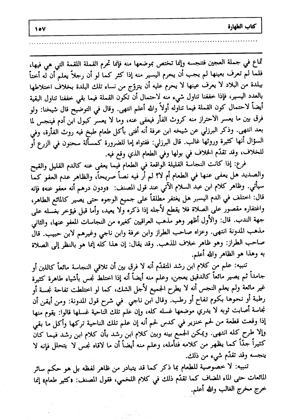 تنبيه : علم من كلام ابن رشد المتقدم أنه لا فرق بين أن تلاقي النجاسة مائعا كاللبن أو جامدا ثم يصير مائعا كالدقيق يعجن وعلم منه أيضا أنه إذا اختلط نجس بأشياء طاهرة كثيرة غير مائعة ولم يعلم النجس أنه لا يطرح الجميع لأجل الشك كما لو اختلطت تفاحة نجسة أو رطبة أو نحوها بكوم تفاح أو رطب وقال ابن ناجي في شرح قول المدونة: ومن أيقن أن نجاسة أصابت ثوبه لا يدري موضعها غسله كله وإن علم تلك الناحية غسلها، قالوا: يقوم منها إذا وقعت قطعة من لحم خنزير في كدس لحم أنه إن علم تلك الناحية تركها وأكل ما بقي وإلا طرح كله انتهى. ويمكن الجمع بينه وبين كلام ابن رشد بأن كلام ابن رشد فيما كان كثيرا جدا كما يظهر من كلامه فتأمله وعلم منه أيضا أن ما لاقاه نجس لا يتحلل فإنه لا ينجسه وقد تقدم شيء من ذلك.