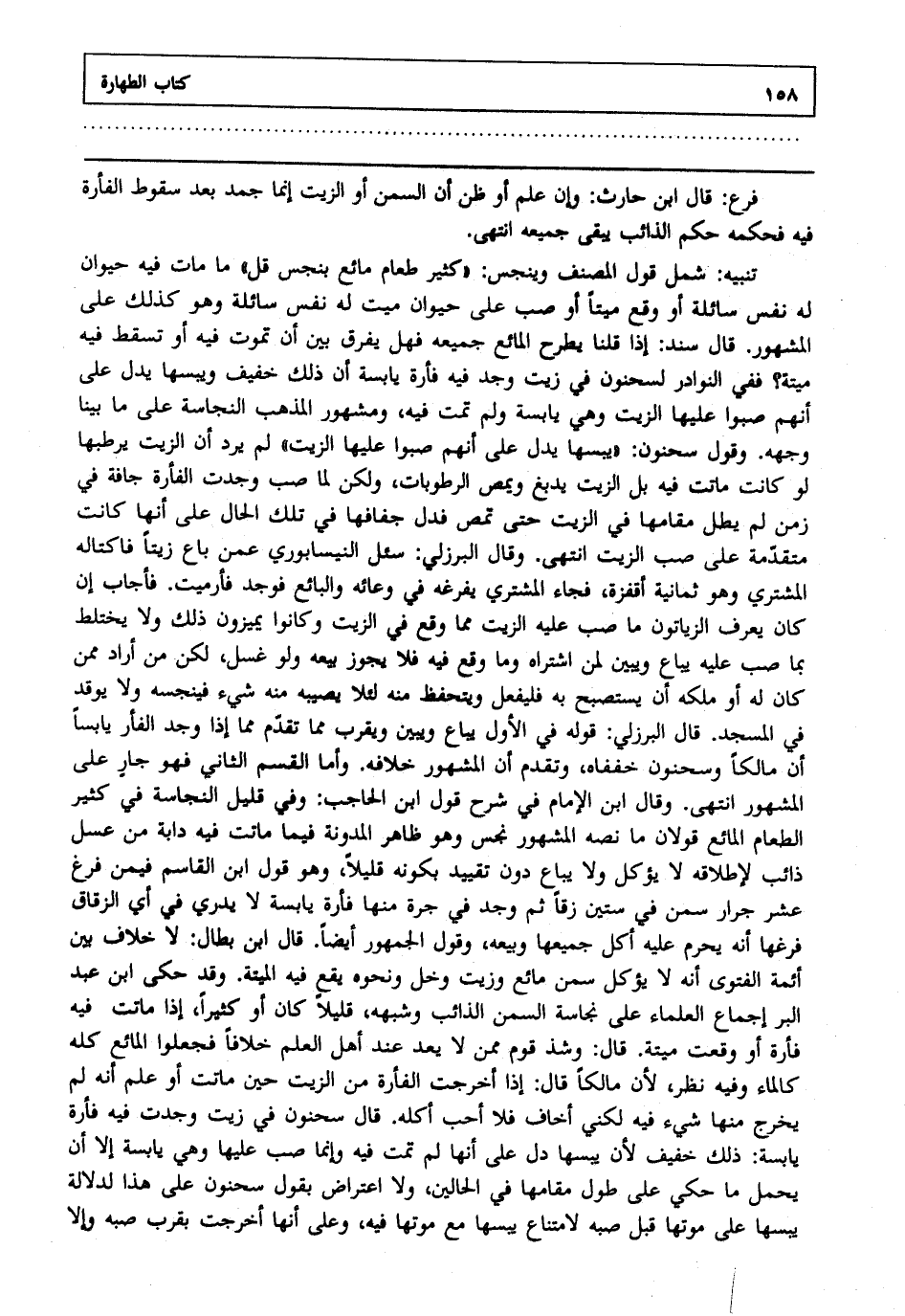 تنبيه : شمل قول المصنف: "وينجس كثير طعام مائع بنجس قل" ما مات فيه حيوان له نفس سائلة أو وقع ميتا أو صب على حيوان ميت له نفس سائلة وهو كذلك على المشهور قال سند: إذا قلنا يطرح المائع جميعه فهل يفرق بين أن تموت فيه أو تسقط فيه ميتة ففي النوادر لسحنون في زيت وجد فيه فأرة يابسة أن ذلك خفيف ويبسها يدل على أنهم صبوا عليها الزيت وهي يابسة ولم تمت فيه ومشهور المذهب النجاسة على ما بينا وجهه وقول سحنون يبسها يدل على أنهم صبوا عليها الزيت لم يرد أن الزيت يرطبها لو كانت ماتت فيه بل الزيت يدبغ ويمص الرطوبات ولكن لما صب وجدت الفأرة جافة في زمن لم يطل مقامها في الزيت حتى تمص فدل جفافها في تلك الحال على أنها كانت متقدمة على صب الزيت انتهى. وقال البرزلي سئل النيسابوري عمن باع زيتا فاكتاله المشتري وهو ثمانية أقفزة فجاء المشتري يفرغه في وعائه والبائع فوجد فأرميت فأجاب إن كان يعرف الزياتون ما صب عليه الزيت مما وقع في الزيت وكانوا يميزون ذلك ولا يختلط بما صب عليه يباع ويبين لمن اشتراه وما وقع فيه فلا يجوز بيعه ولو غسل لكن من أراد ممن كان له أو ملكه أن يستصبح به فليفعل ويتحفظ منه لئلا يصيبه منه شيء فينجسه ولا يوقد في المسجد قال البرزلي قوله في الأول يباع ويبين ويقرب مما تقدم مما إذا وجد الفأر يابسا أن مالكا وسحنون خففاه وتقدم أن المشهور خلافه وأما القسم الثاني فهو جار على المشهور انتهى. وقال ابن الإمام في شرح قول ابن الحاجب وفي قليل النجاسة في كثير الطعام المائع قولان ما نصه المشهور نجس وهو ظاهر المدونة فيما ماتت فيه دابة من عسل ذائب لإطلاقه لا يؤكل ولا يباع دون تقييد بكونه قليلا وهو قول ابن القاسم فيمن فرغ عشر جرار سمن في ستين زقا ثم وجد في جرة منها فأرة يابسة لا يدري في أي الزقاق فرغها أنه يحرم عليه أكل جميعها وبيعه وقول الجمهور أيضا قال ابن بطال لا خلاف بين أئمة الفتوى أنه لا يؤكل سمن مائع وزيت وخل ونحوه يقع فيه الميتة وقد حكى ابن عبد البر إجماع العلماء على نجاسة السمن الذائب وشبهه قليلا كان أو كثيرا إذا ماتت فيه فأرة أو وقعت ميتة قال وشذ قوم ممن لا يعد عند أهل العلم خلافا فجعلوا المائع كله كالماء وفيه نظر لأن مالكا قال إذا أخرجت الفأرة من الزيت حين ماتت أو علم أنه لم يخرج منها شيء فيه لكني أخاف فلا أحب أكله قال سحنون في زيت وجدت فيه فأرة يابسة: ذلك خفيف لأن يبسها دل على أنها لم تمت فيه وإنما صب عليها وهي يابسة إلا أن يحمل ما حكي على طول مقامها في الحالين ولا اعتراض بقول سحنون على هذا لدلالة يبسها على موتها قبل صبه لامتناع يبسها مع موتها فيه وعلى أنها أخرجت بقرب صبه وإلا