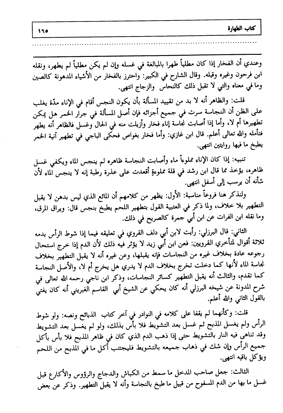 ولنذكر هنا فروعا مناسبة: الأول : يظهر من كلامهم أن المائع الذي ليس بدهن لا يقبل التطهير بلا خلاف ولما ذكر في العتبية القول بتطهير اللحم يطبخ بنجس قال ويراق المرق وما نقله ابن الفرات عن ابن أبي جمرة كالصريح في ذلك.