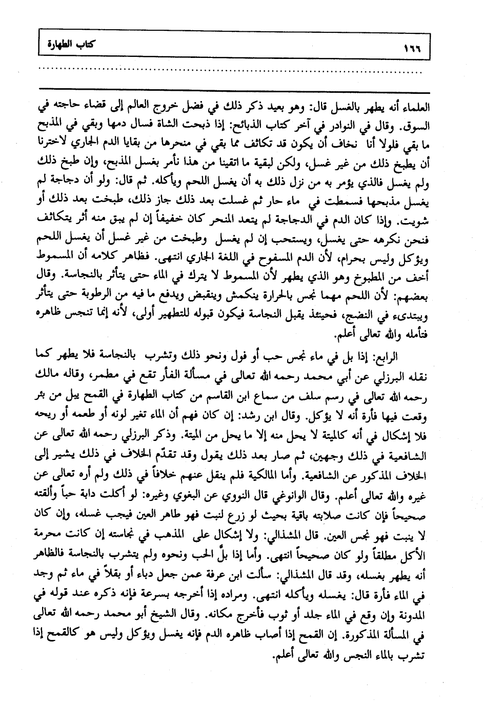 العلماء أنه يطهر كمال قال وهو بعيد ذكر ذلك في فضل خروج العالم إلى قضاء حاجته في السوق وقال في النوادر في آخر كتاب الذبائح إذا ذبحت الشاة فسال دمها وبقي في المذبح ما بقي فلولا أنا نخاف أن يكون قد تكاثف مما بقي في منحرها من بقايا الدم الجاري لاخترنا أن يطبخ ذلك من غير غسل ولكن لبقية ما اتقينا من هذا نأمر بغسل المذبح وإن طبخ ذلك ولم يغسل فالذي يؤمر به من نزل ذلك به أن يغسل اللحم ويأكله ثم قال ولو أن دجاجة لم يغسل مذبحها فسمطت في ماء حار ثم غسلت بعد ذلك جاز ذلك طبخت بعد ذلك أو شويت وإذا كان الدم في الدجاجة لم يتعد المنحر كان خفيفا إن لم يبق منه أثر يتكاثف فنحن نكرهه حتى يغسل ويستحب إن لم يغسل وطبخت من غير غسل أن يغسل اللحم ويؤكل وليس بحرام لأن الدم المسفوح في اللغة الجاري انتهى. فظاهر كلامه أن المسموط أخف من المطبوخ وهو الذي يطهر لأن المسموط لا يترك في الماء حتى يتأثر بالنجاسة وقال بعضهم لأن اللحم مهما نجس بالحرارة ينكمش وينقبض ويدفع ما فيه من الرطوبة حتى يتأثر ويبتدئ في النضج فحينئذ يقبل النجاسة فيكون قبوله للتطهير أولى لأنه إنما تنجس ظاهره فتأمله والله تعالى أعلم.