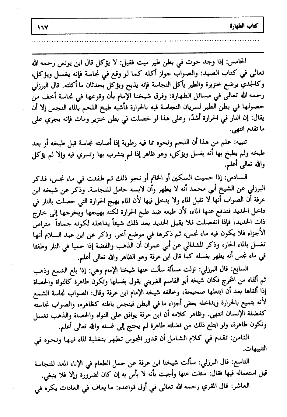 السادس : إذا حميت السكين أو الخاتم أو نحو ذلك ثم طفئت في ماء نجس فذكر البرزلي عن الشيخ أبي محمد أنه لا يطهر وأن لابسه حامل للنجاسة وذكر عن شيخه ابن عرفة أن الصواب أنها لا تقبل الماء ولا يدخل فيها لأن الماء يهيج الحرارة التي حصلت بالنار في داخل الحديد فتدفع عنها الماء لأن طبعه ضد طبع الحرارة لكنه يهيجها ويخرجها إلى خارج ذات الحديد فإذا انفصلت فلا يقبل الحديد بعد ذلك شيئا يداخله لكونه جمادا متراص الأجزاء فلا يكون فيه ماء نجس ثم ذكرها في موضع آخر وذكر عن ابن عبد السلام أنها تغسل بالماء الحار وذكر المشذالي عن أبي عمران أن الذهب والفضة إذا حميا في النار وطفئا في ماء نجس أنه يطهر بغسله كما قال ابن عرفة: وهو الظاهر والله تعالى أعلم.