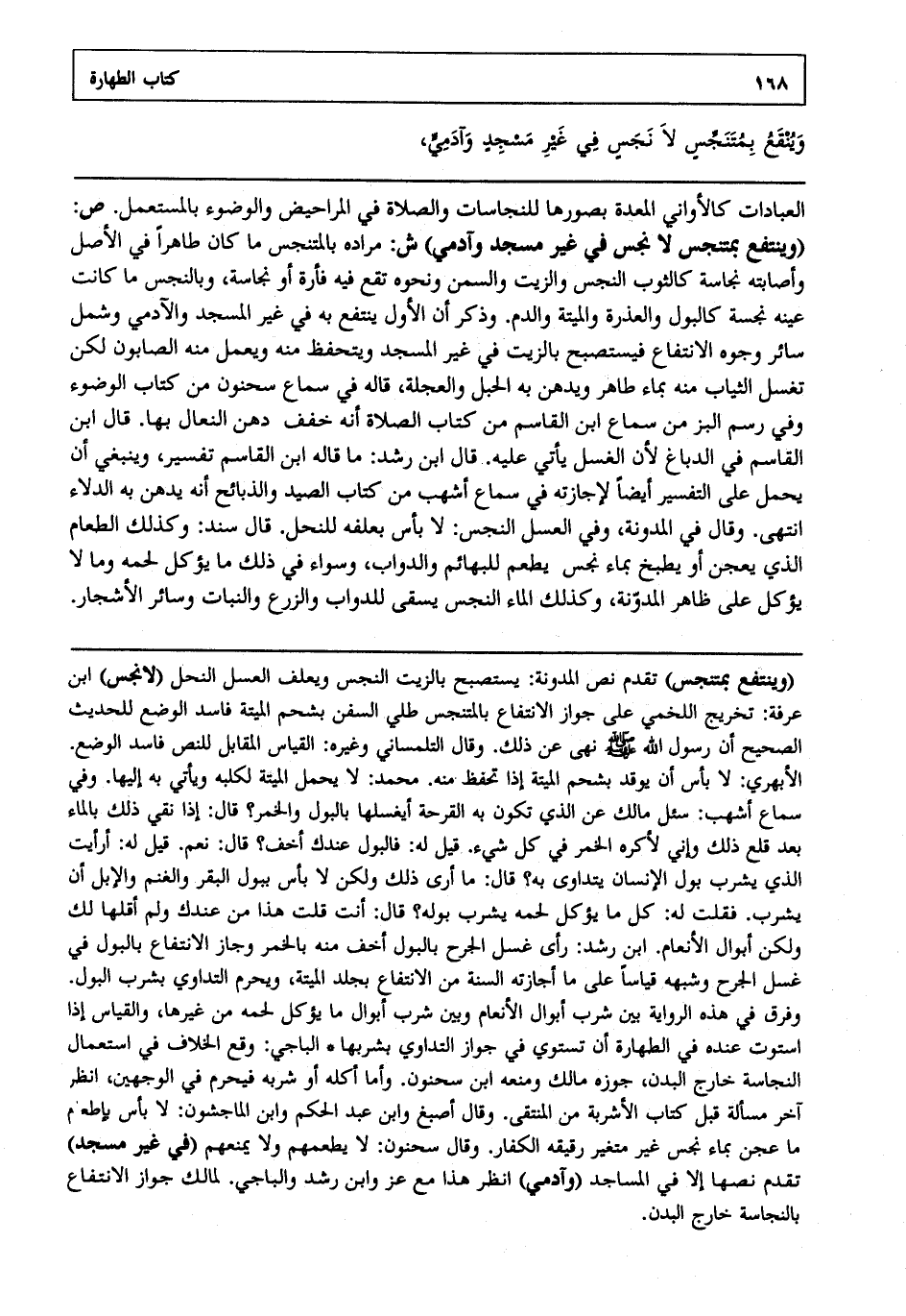 العبادات كالأواني المعدة بصورها للنجاسات والصلاة في المراحيض والوضوء بالمستعمل ص: "وينتفع بمتنجس لا نجس في غير مسجد وآدمي" ش: مراده بالمتنجس ما كان طاهرا في الأصل وأصابته نجاسة كالثوب النجس والزيت والسمن ونحوه تقع فيه فأرة أو نجاسة وبالنجس ما كانت عينه نجسة كالبول والعذرة والميتة والدم وذكر أن الأول ينتفع به في غير المسجد والآدمي وشمل سائر وجوه الانتفاع فيستصبح بالزيت في غير المسجد ويتحفظ منه ويعمل منه الصابون لكن تغسل الثياب منه بماء طاهر ويدهن به الحبل والعجلة قاله في سماع سحنون من كتاب الوضوء وفي رسم البز من سماع ابن القاسم من كتاب الصلاة أنه خفف دهن النعال بها قال ابن القاسم في الدباغ: لأن الغسل يأتي عليه قال ابن رشد: ما قاله ابن القاسم تفسير وينبغي أن يحمل على التفسير أيضا لإجازته في سماع أشهب من كتاب الصيد والذبائح أنه يدهن به الدلاء انتهى. وقال في المدونة: وفي العسل النجس لا بأس بعلفه للنحل قال سند: وكذلك الطعام الذي يعجن أو يطبخ بماء نجس يطعم للبهائم والدواب وسواء في ذلك ما يؤكل لحمه وما لا يؤكل على ظاهر المدونة وكذلك الماء النجس يسقى للدواب والزرع والنبات وسائر الأشجار.