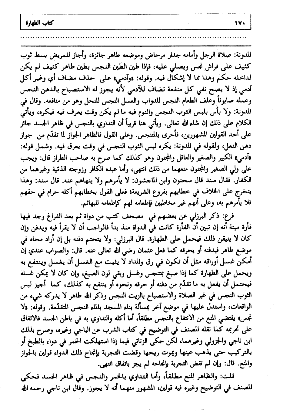 المدونة: صلاة الرجل وأمامه جدار مرحاض وموضعه طاهر جائزة وأجاز للمريض بسط ثوب كثيف على فراش نجس ويصلى عليه فإذا طين الطين النجس بطين طاهر كثيف لم يكن لداخله حكم وهذا مما لا إشكال فيه وقوله وآدمي على حذف مضاف أي وغير أكل آدمي إذ لا يصح نفي كل منفعة تضاف للآدمي لأنه يجوز له الاستصباح بالدهن النجس وعمله صابونا وعلف الطعام النجس للدواب والعسل النجس للنحل وهو من منافعه وقال في المدونة: ولا بأس بلبس الثوب النجس والنوم فيه ما لم يكن وقت يعرف فيه فيكره ويأتي الكلام على ذلك إن شاء الله تعالى ويأتي هنا قريبا أن التداوي بالنجس في ظاهر الجسد جائز على أحد القولين المشهورين فأحرى بالمتنجس وعلى القول فالظاهر الجواز لما تقدم من جواز دهن النعل ولقوله في المدونة يكره لبس الثوب النجس في وقت يعرق فيه وشمل قوله آدمي الكبير والصغير والعاقل والمجنون وهو كذلك كما صرح به صاحب الطراز قال ويجب على ولي الصغير والمجنون منعهما من ذلك انتهى. وأما عبده الكافر وزوجته الذمية وغيرهما من الكفار فقال سند قال سحنون وابن الماجشون: لا يأمرهم ولا ينهاهم عنه قال سند: وهذا يتخرج على الخلاف في خطابهم بفروع الشريعة فعلى القول بخطابهم أكله حرام في حقهم فلا يأمرهم به وعلى أنهم غير مخاطبين فإطعامه لهم كإطعامه للبهائم.