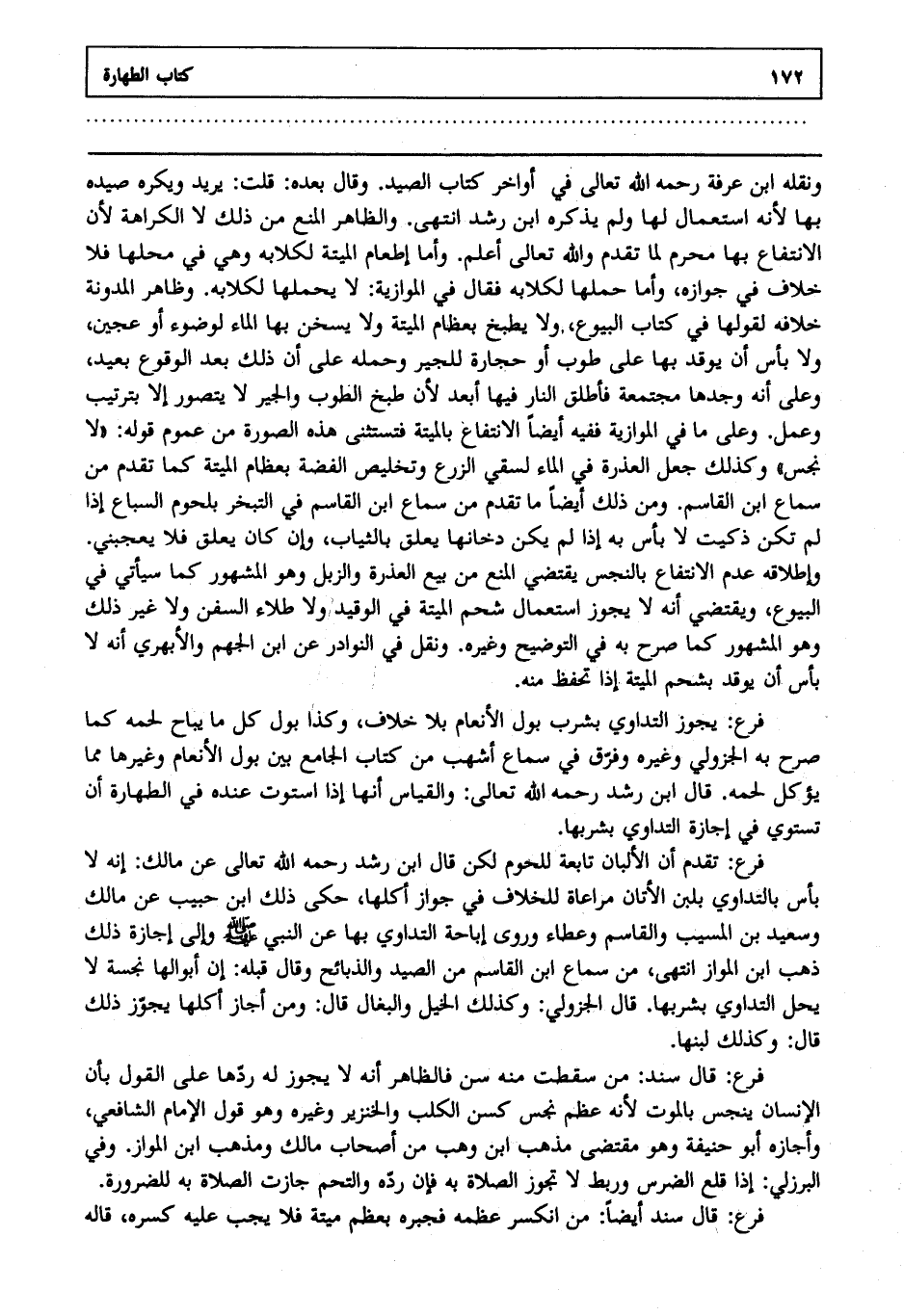 ونقله ابن عرفة رحمه الله تعالى في أواخر كتاب الصيد وقال بعده قلت: يريد ويكره صيده بها لأنه استعمال لها ولم يذكره ابن رشد انتهى. والظاهر المنع من ذلك لا الكراهة لأن الانتفاع بها محرم لما تقدم والله تعالى أعلم. وأما الطعام الميتة لكلابه وهي في محلها فلا خلاف في جوازه وأما حملها لكلابه فقال في الموازية لا يحملها لكلابه وظاهر المدونة خلافه لقولها في كتاب البيوع ولا يطبخ بعظام الميتة ولا يسخن بها الماء لوضوء أو عجين ولا بأس أن يوقد بها على طوب أو حجارة للجير وحمله على أن ذلك بعد الوقوع بعيد وعلى أنه وجدها مجتمعة فأطلق النار فيها أبعد لأن طبخ الطوب والجير لا يتصور إلا بترتيب وعمل وعلى ما في الموازية ففيه أيضا الانتفاع بالميتة فتستثنى هذه الصورة من عموم قوله لا نجس وكذلك جعل العذرة في الماء لسقي الزرع وتخليص الفضة بعظام الميتة كما تقدم من سماع ابن القاسم ومن ذلك أيضا ما تقدم من سماع ابن القاسم في التبخر إذا لم تكن ذكيت لا بأس به إذا لم يكن دخانها يعلق بالثياب وإن كان يعلق فلا يعجبني وإطلاقه عدم الانتفاع بالنجس يقتضي المنع من بيع العذرة والزبل وهو المشهور كما سيأتي في البيوع ويقتضي أنه لا يجوز استعمال شحم الميتة في الوقيد ولا طلاء السفن ولا غير ذلك وهو المشهور كما صرح به في التوضيح وغيره ونقل في النوادر عن ابن الجهم والأبهري أنه لا بأس أن يوقد بشحم الميتة إذا تحفظ منه.