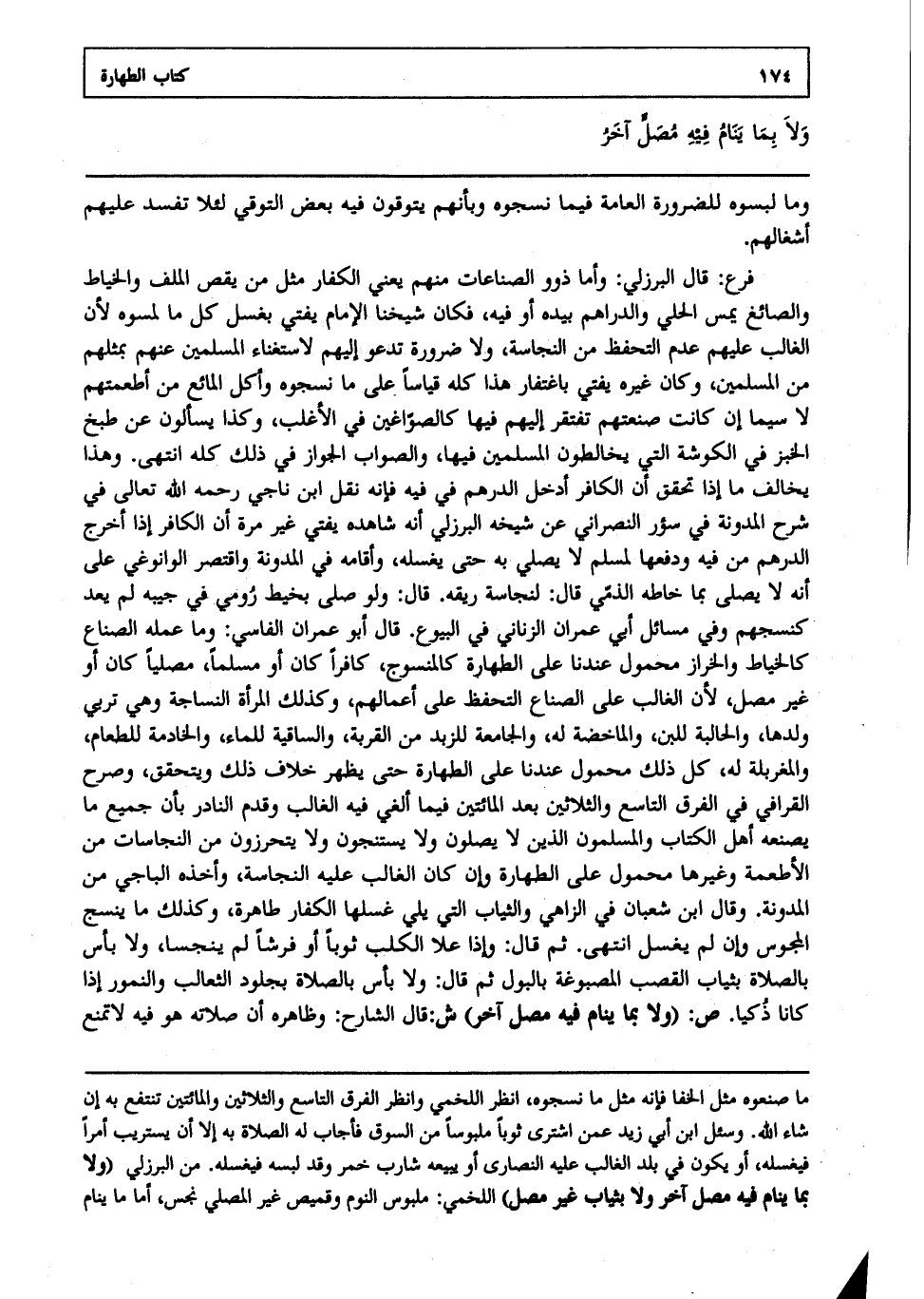 فرع : قال البرزلي وأما ذوو الصناعات منهم يعني الكفار مثل من يقص الملف والخياط والصائغ يمس الحلي والدراهم بيده أو فيه فكان شيخنا الإمام يفتي بغسل كل ما لمسوه لأن الغالب عليهم عدم التحفظ من النجاسة ولا ضرورة تدعو إليهم لاستغناء المسلمين عنهم بمثلهم من المسلمين وكان غيره يفتي باغتفار هذا كله قياسا على ما نسجوه وأكل المائع من أطعمتهم لا سيما إن كانت صنعتهم تفتقر إليهم فيها كالصواغين في الأغلب وكذا يسألون عن طبخ الخبز في الكوشة التي يخالطون المسلمين فيها والصواب الجواز في ذلك كله انتهى. وهذا يخالف ما إذا تحقق أن الكافر أدخل الدرهم في فيه فإنه نقل ابن ناجي رحمه الله تعالى في شرح المدونة في سؤر النصراني عن شيخه البرزلي أنه شاهده يفتي غيرمرة أن الكافر إذا أخرج الدرهم من فيه ودفعها لمسلم لا يصلي به حتى يغسله وأقامه في المدونة واقتصر الوانوغي على أنه لا يصلى بما خاطه الذمي قال لنجاسة ريقه قال ولو صلى بخيط رومي في جيبه لم يعد كنسجهم وفي مسائل أبي عمران الزناني في البيوع قال أبو عمران الفاسي وما عمله الصناع كالخياط والخراز محمول عندنا على الطهارة كالمنسوج كافرا كان أو مسلما مصليا كان أو غير مصل لأن الغالب على الصناع التحفظ على أعمالهم وكذلك المرأة النساجة وهي تربي ولدها والحالبة للبن والماخضة له والجامعة للزبد من القربة والساقية للماء والخادمة للطعام والمغربلة له كل ذلك محمول عندنا على الطهارة حتى يظهر خلاف ذلك ويتحقق وصرح القرافي في الفرق التاسع والثلاثين بعد المائتين فيما ألغي فيه الغالب وقدم النادر بأن جميع ما يصنعه أهل الكتاب والمسلمون الذين لا يصلون ولا يستنجون ولا يتحرزون من النجاسات من الأطعمة وغيرها محمول على الطهارة وإن كان الغالب عليه النجاسة وأخذه الباجي من المدونة وقال ابن شعبان في الزاهي والثياب التي يلي غسلها الكفار طاهرة وكذلك ما ينسج المجوس وإن لم يغسل انتهى. ثم قال وإذا علا الكلب ثوبا أو فرشا لم ينجسا ولا بأس بالصلاة بثياب القصب المصبوغة بالبول ثم قال ولا بأس بالصلاة بجلود الثعالب والنمور إذا كانا ذكيا ص: "ولا بما ينام فيه مصل آخر" ش: قال الشارح وظاهره أن صلاته هو فيه لا تمنع