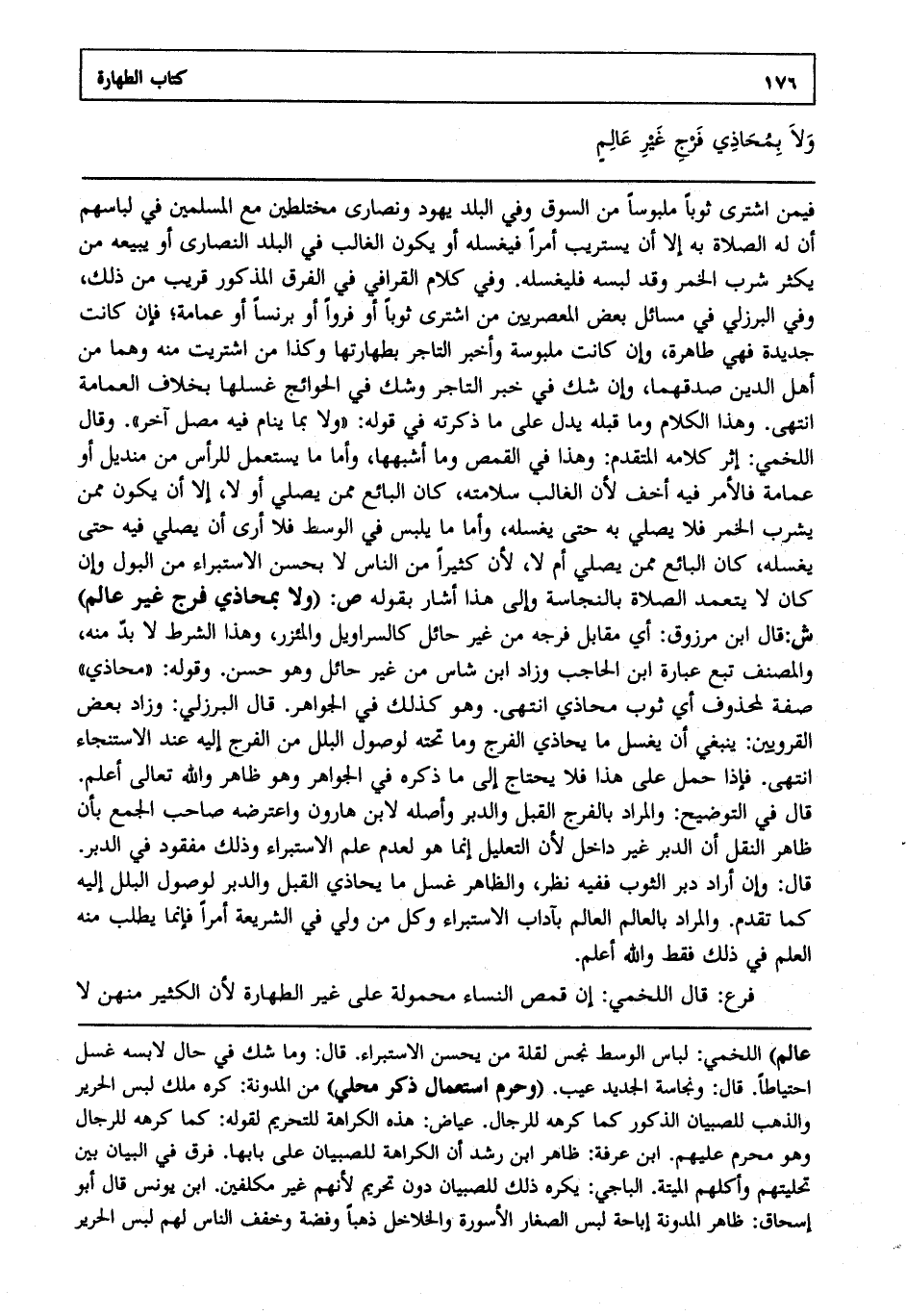فيمن اشترى ثوبا ملبوسا من السوق وفي البلد يهود ونصارى مختلطين مع المسلمين في لباسهم أن له الصلاة به إلا أن يستريب أمرا فيغسله أو يكون الغالب في البلد النصارى أو يبيعه من يكثر شرب الخمر وقد لبسه فليغسله وفي كلام القرافي في الفرق المذكور قريب من ذلك وفي البرزلي في مسائل بعض المعصريين من اشترى ثوبا أو فروا أو برنسا أو عمامة فإن كانت جديدة فهي طاهرة وإن كانت ملبوسة وأخبر التاجر بطهارتها وكذا من اشتريت منه وهما من أهل الدين صدقهما وإن شك في خبر التاجر وشك في الحوائج غسلها بخلاف العمامة انتهى. وهذا الكلام وما قبله يدل على ما ذكرته في قوله ولا بما ينام فيه مصل آخر وقال اللخمي إثر كلامه المتقدم وهذا في القمص وما أشبهها وأما ما يستعمل للرأس من منديل أو عمامة فالأمر فيه أخف لأن الغالب سلامته كان البائع ممن يصلي أو لا إلا أن يكون ممن يشرب الخمر فلا يصلي به حتى يغسله وأما ما يلبس في الوسط فلا أرى أن يصلي فيه حتى يغسله كان البائع ممن يصلي أم لا لأن كثيرا من الناس لا يحسن الاستبراء من البول وإن كان لا يتعمد الصلاة بالنجاسة وإلى هذا أشار بقوله ص: "ولا بمحاذي فرج غير عالم" ش: قال ابن مرزوق أي مقابل فرجه حائل كالسراويل والمئزر وهذا الشرط لا بد منه والمصنف تبع عبارة ابن الحاجب وزاد ابن شاس حائل وهو حسن وقوله محاذي صفة لمحذوف أي ثوب محاذي انتهى. وهو كذلك في الجواهر قال البرزلي وزاد بعض القرويين ينبغي أن يغسل ما يحاذي الفرج وما تحته لوصول البلل من الفرج إليه عند الاستنجاء انتهى. فإذا حمل على هذا فلا يحتاج إلى ما ذكره في الجواهر وهو ظاهر والله تعالى أعلم. قال في التوضيح: والمراد بالفرج القبل والدبر وأصله لابن هارون واعترضه صاحب الجمع بأن ظاهر النقل أن الدبر غير داخل لأن التعليل إنما هو لعدم علم الاستبراء وذلك مفقود في الدبر قال وإن أراد دبر الثوب ففيه نظر والظاهر غسل ما يحاذي القبل والدبر لوصول البلل إليه كما تقدم والمراد بالعالم العالم بآداب الاستبراء وكل من ولي في الشريعة أمرا فإنما يطلب منه العلم في ذلك فقط والله أعلم.