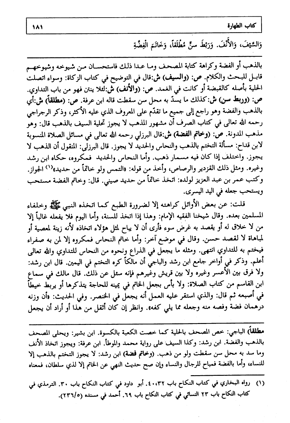 بالذهب أو الفضة وكراهة كتابة المصحف وما عدا ذلك فاستحسان من شيوخه وشيوخهم قابل للبحث والكلام ص: "والسيف" ش: قال في التوضيح في كتاب الزكاة: وسواء اتصلت الحلية بأصله كالقبضة أو كانت في الغمد ص: "والأنف" ش: لئلا ينتن فهو من باب التداوي ص: "وربط سن" ش: كذلك ما يسد به محل سن سقطت قاله ابن عرفة ص: "مطلقا" ش: أي بالذهب والفضة وهو راجع إلى جميع ما تقدم على المعروف الذي عليه الأكثر وذكر الرجراجي رحمه الله تعالى في كتاب الصرف أن مشهور المذهب لا يجوز تحلية السيف بالذهب قال وهو مذهب المدونة ص: "وخاتم الفضة" ش: قال البرزلي رحمه الله تعالى في مسائل الصلاة المنسوبة لابن قداح مسألة التختم بالذهب والنحاس والحديد لا يجوز قال البرزلي المنقول أن الذهب لا يجوز واختلف إذا كان فيه مسمار ذهب وأما النحاس والحديد فمكروه حكاه ابن رشد وغيره ومثل ذلك القزدير والرصاص وأخذ من قوله: "التمس ولو خاتما من حديد" 1 الجواز وكتب عمر بن عبد العزيز لولده اتخذ خاتما من حديد صيني قال وخاتم الفضة مستحب ويستحب جعله في اليد اليسرى.