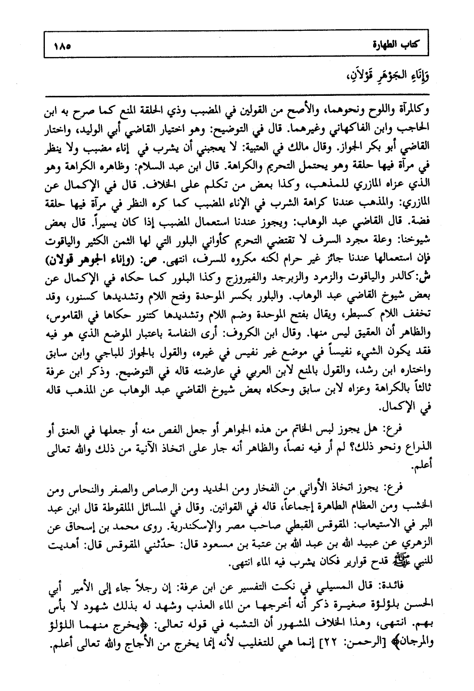 وكالمرآة واللوح ونحوهما والأصح من القولين في المضبب وذي الحلقة المنع كما صرح به ابن الحاجب وابن الفاكهاني وغيرهما قال في التوضيح: وهو اختيار القاضي أبي الوليد واختار القاضي أبو بكر الجواز وقال مالك في العتبية لا يعجبني أن يشرب في إناء مضبب ولا ينظر في مرآة فيها حلقة وهو يحتمل التحريم والكراهة قال بن عبد السلام وظاهره الكراهة وهو الذي عزاه المازري للمذهب وكذا بعض من تكلم على الخلاف قال في الإكمال عن المازري والمذهب عندنا كراهة الشرب في الإناء المضبب كما كره النظر في مرآة فيها حلقة فضة قال القاضي عبد الوهاب: ويجوز عندنا استعمال المضبب إذا كان يسيرا قال بعض شيوخنا وعلة مجرد السرف لا تقتضي التحريم كأواني البلور التي لها الثمن الكثير والياقوت فإن استعمالها عندنا جائز غير حرام لكنه مكروه للسرف انتهى. ص: "وإناء الجوهر قولان" ش: كالدر والياقوت والزمرد والزبرجد والفيروزج وكذا البلور كما حكاه في الإكمال عن بعض شيوخ القاضي عبد الوهاب والبلور بكسر الموحدة وفتح اللام وتشديدها كسنور وقد تخفف اللام كسبطر ويقال بفتح الموحدة وضم اللام وتشديدها كتنور حكاها في القاموس والظاهر أن العقيق ليس منها وقال ابن الكروف أرى النفاسة باعتبار الموضع الذي هو فيه فقد يكون الشيء نفيسا في موضع غير نفيس في غيره والقول بالجواز للباجي وابن سابق واختاره ابن رشد والقول بالمنع لابن العربي في عارضته قاله في التوضيح وذكر ابن عرفة ثالثا بالكراهة وعزاه لابن سابق وحكاه بعض شيوخ القاضي عبد الوهاب عن المذهب قاله في الإكمال.