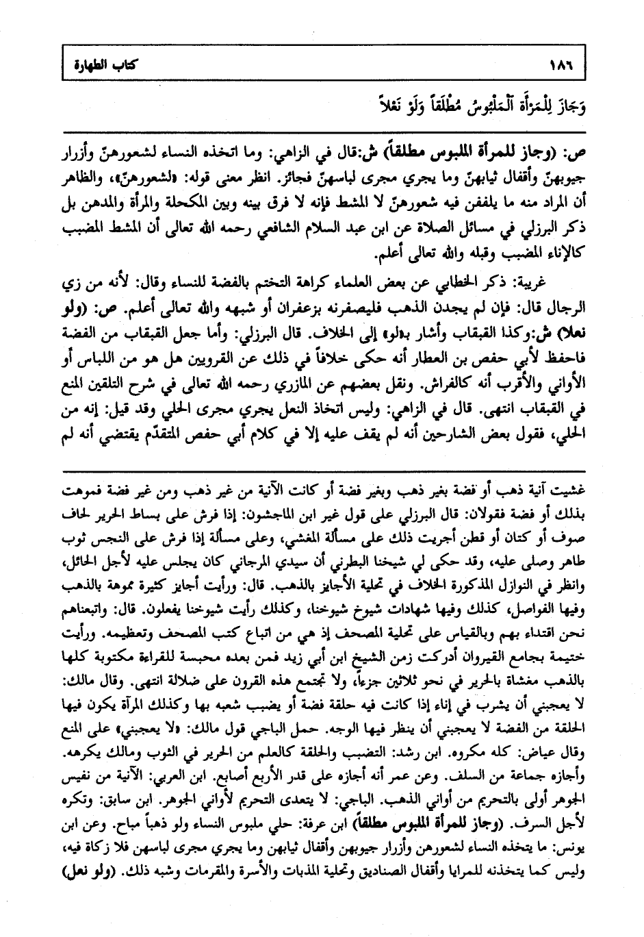 ص: "وجاز للمرأة الملبوس مطلقا" ش: قال في الزاهي وما اتخذه النساء لشعورهن وأزرار جيوبهن وأقفال ثيابهن وما يجري مجرى لباسهن فجائز انظر معنى قوله لشعورهن والظاهر أن المراد منه ما يلففن فيه شعورهن لا المشط فإنه لا فرق بينه وبين المكحلة والمرأة والمدهن بل ذكر البرزلي في مسائل الصلاة عن ابن عبد السلام الشافعي رحمه الله تعالى أن المشط المضبب كالإناء المضبب وقبله والله تعالى أعلم. غريبة ذكر الخطابي عن بعض العلماء كراهة التختم بالفضة للنساء وقال لأنه من زي الرجال قال فإن لم يجدن الذهب فليصفرنه بزعفران أو شبهه والله تعالى أعلم. ص: "ولو نعلا" ش: وكذا القبقاب وأشار بلو إلى الخلاف قال البرزلي وأما جعل القبقاب من الفضة فاحفظ لأبي حفص بن العطار أنه حكى خلافا في ذلك عن القرويين هل هو من اللباس أو الأواني والأقرب أنه كالفراش ونقل بعضهم عن المازري رحمه الله تعالى في شرح التلقين المنع في القبقاب انتهى. قال في الزاهي وليس اتخاذ النعل يجري مجرى الحلي وقد قيل إنه من الحلي فقول بعض الشارحين أنه لم يقف عليه إلا في كلام أبي حفص المتقدم يقتضي أنه لم
