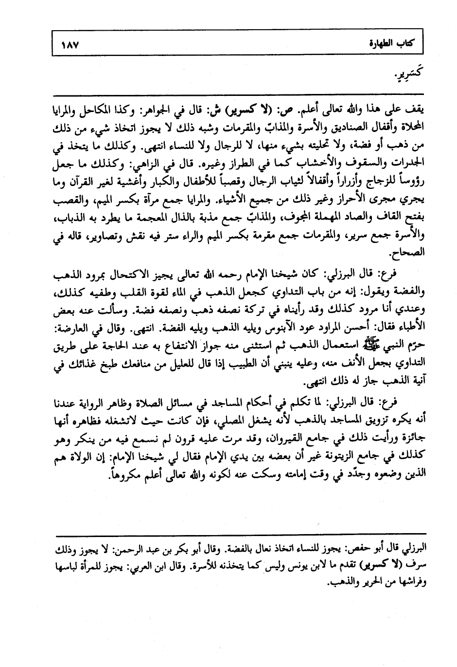 يقف على هذا والله تعالى أعلم. ص: "لا كسرير" ش: قال في الجواهر: وكذا المكاحل والمرايا المحلاة وأقفال الصناديق والأسرة والمذاب والمقرمات وشبه ذلك لا يجوز اتخاذ شيء من ذلك من ذهب أو فضة ولا تحليته بشيء منها لا للرجال ولا للنساء انتهى. وكذلك ما يتخذ في الجدرات والسقوف والأخشاب كما في الطراز وغيره قال في الزاهي وكذلك ما جعل رؤوسا للزجاج وأزرارا وأقفالا لثياب الرجال وقصبا للأطفال والكبار وأغشية لغير القرآن وما يجري مجرى الأحراز وغير ذلك من جميع الأشياء والمرايا جمع مرآة بكسر الميم والقصب بفتح القاف والصاد المهملة المجوف والمذاب جمع مذبة بالذال المعجمة ما يطرد به الذباب والأسرة جمع سرير والمقرمات جمع مقرمة بكسر الميم والراء ستر فيه نقش وتصاوير قاله في الصحاح.