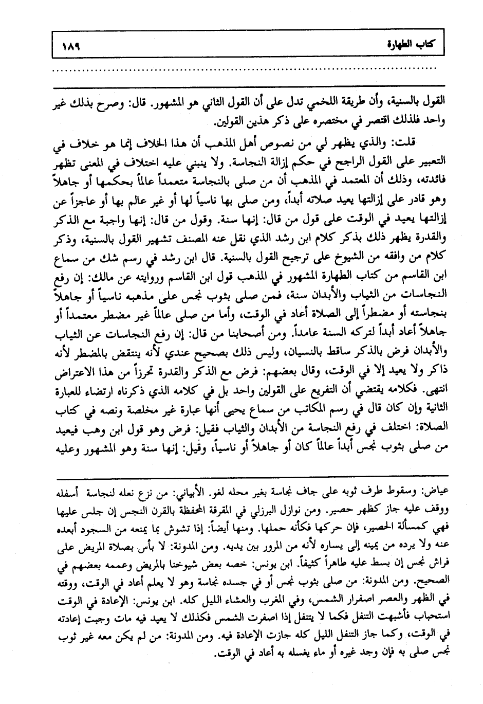 قلت: والذي يظهر لي من نصوص أهل المذهب أن هذا الخلاف إنما هو خلاف في التعبير على القول الراجح في حكم إزالة النجاسة ولا ينبني عليه اختلاف في المعنى تظهر فائدته وذلك أن المعتمد في المذهب أن من صلى بالنجاسة متعمدا عالما بحكمها أو جاهلا وهو قادر على إزالتها يعيد صلاته أبدا ومن صلى بها ناسيا لها أو غير عالم بها أو عاجزا عن إزالتها يعيد في الوقت على قول من قال إنها سنة وقول من قال إنها واجبة مع الذكر والقدرة يظهر ذلك بذكر كلام ابن رشد الذي نقل عنه المصنف تشهير القول بالسنية وذكر كلام من وافقه من الشيوخ على ترجيح القول بالسنية قال ابن رشد في رسم شك من سماع ابن القاسم من كتاب الطهارة المشهور في المذهب: قول ابن القاسم وروايته عن مالك: إن رفع النجاسات من الثياب والأبدان سنة فمن صلى بثوب نجس على مذهبه ناسيا أو جاهلا بنجاسته أو مضطرا إلى الصلاة أعاد في الوقت وأما من صلى عالما غير مضطر معتمدا أو جاهلا أعاد أبدا لتركه السنة عامدا ومن أصحابنا من قال إن رفع النجاسات عن الثياب والأبدان فرض بالذكر ساقط بالنسيان وليس ذلك بصحيح عندي لأنه ينتقض بالمضطر لأنه ذاكر ولا يعيد إلا في الوقت وقال بعضهم فرض مع الذكر والقدرة تحرزا من هذا الاعتراض انتهى. فكلامه يقتضي أن التفريع على القولين واحد بل في كلامه الذي ذكرناه ارتضاء للعبارة الثانية وإن كان قال في رسم المكاتب من سماع يحيى أنها عبارة غير مخلصة ونصه في كتاب الصلاة اختلف في رفع النجاسة من الأبدان والثياب فقيل فرض وهو قول ابن وهب فيعيد من صلى بثوب نجس أبدا عالما كان أو جاهلا أو ناسيا وقيل إنها سنة وهو المشهور وعليه