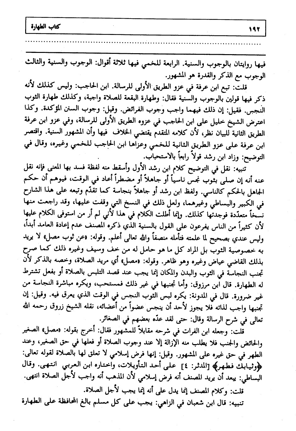قلت: تبع ابن عرفة في عزو الطريق الأولى للرسالة ابن الحاجب وليس كذلك لأنه ذكر فيها قولين بالوجوب والسنية فقال وطهارة البقعة للصلاة واجبة وكذلك طهارة الثوب النجس فقيل إن ذلك فيهما واجب وجوب الفرائض وقيل وجوب السنن المؤكدة وكذا اعترض الشيخ خليل على ابن الحاجب في عزوه الطريق الأولى للرسالة وفي عزو ابن عرفة الطريق الثانية للبيان نظر لأن كلامه المتقدم يقتضي الخلاف فيها وأن المشهور السنية واقتصر ابن عرفة على عزو الطريق الثانية للخمي وعزاها ابن الحاجب للخمي وغيره وقال في التوضيح: وزاد ابن رشد قولا رابعا بالاستحباب.