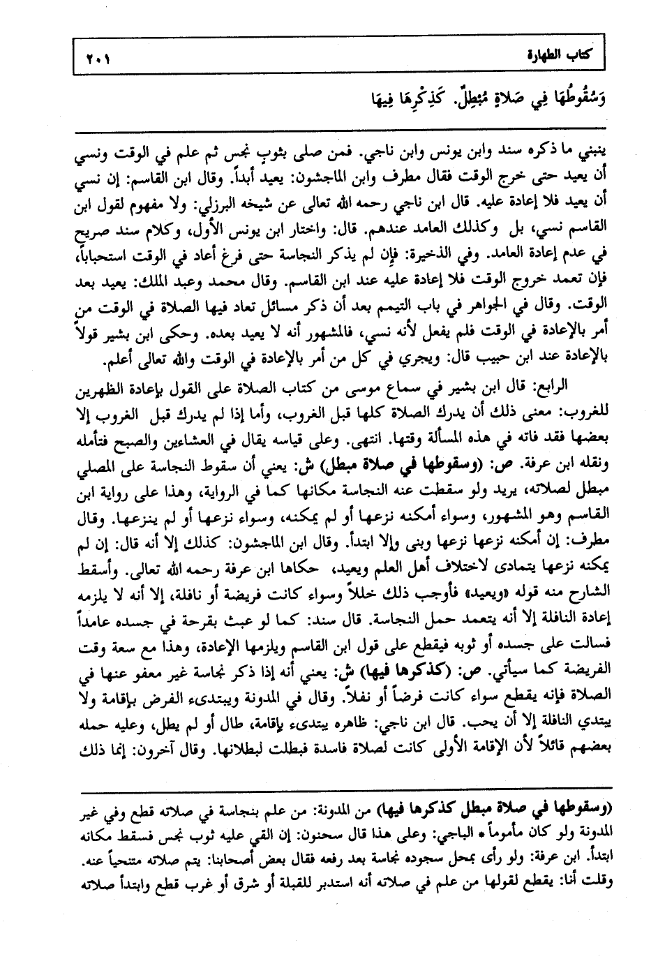 الرابع : قال ابن بشير في سماع موسى من كتاب الصلاة على القول بإعادة الظهرين للغروب: معنى ذلك أن يدرك الصلاة كلها قبل الغروب وأما إذا لم يدرك قبل الغروب إلا بعضها فقد فاته في هذه المسألة وقتها انتهى. وعلى قياسه يقال في العشاءين والصبح فتأمله ونقله ابن عرفة ص: "وسقوطها في صلاة مبطل" ش: يعني أن سقوط النجاسة على المصلي مبطل لصلاته يريد ولو سقطت عنه النجاسة مكانها كما في الرواية وهذا على رواية ابن القاسم وهو المشهور وسواء أمكنه نزعها أو لم يمكنه وسواء نزعها أو لم ينزعها وقال مطرف إن أمكنه نزعها نزعها وبنى وإلا ابتدأ وقال ابن الماجشون كذلك إلا أنه قال إن لم يمكنه نزعها يتمادى لاختلاف أهل العلم ويعيد حكاها ابن عرفة رحمه الله تعالى وأسقط الشارح منه قوله ويعيد فأوجب ذلك خللا وسواء كانت فريضة أو نافلة إلا أنه لا يلزمه إعادة النافلة إلا أنه يتعمد حمل النجاسة قال سند: كما لو عبث بقرحة في جسده عامدا فسالت على جسده أو ثوبه فيقطع على قول ابن القاسم ويلزمها الإعادة وهذا مع سعة وقت الفريضة كما سيأتي ص: "كذكرها فيها" ش: يعني أنه إذا ذكر نجاسة غير معفو عنها في الصلاة فإنه يقطع سواء كانت فرضا أو نفلا وقال في المدونة: ويبتدىء الفرض بإقامة ولا يبتدي النافلة إلا أن يحب قال بن ناجي ظاهره يبتدىء بإقامة طال أو لم يطل وعليه حمله بعضهم قائلا لأن الإقامة الأولى كانت لصلاة فاسدة فبطلت لبطلانها وقال آخرون: إنما ذلك