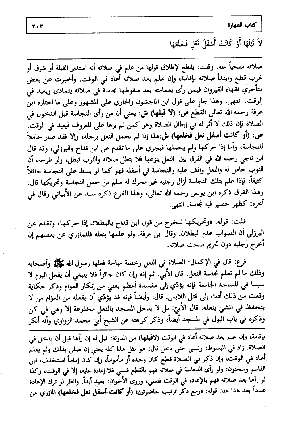 صلاته متنحيا عنه وقلت يقطع لإطلاق قولها من علم في صلاته أنه استدبر القبلة أو شرق أو غرب قطع وابتدأ صلاته بإقامة وإن علم بعد صلاته أعاد في الوقت وأخبرت عن بعض متأخري فقهاء القيروان فيمن رأى بعمامته بعد سقوطها نجاسة في صلاته يتمادى ويعيد في الوقت انتهى. وهذا جار على قول ابن الماجشون والجاري على المشهور وعلى ما اختاره ابن عرفة رحمه الله تعالى القطع ص: "لا قبلها" ش: يعني أن من رأى النجاسة قبل الدخول في الصلاة فإن ذلك لا أثر له في إبطال الصلاة وهو كمن لم يرها على المعروف فيعيد في الوقت ص: "أو كانت أسفل نعل فخلعها" ش: هذا إذا لم يحمل النعل برجله وإلا فقد صار حاملا للنجاسة وأما إذا حركها ولم يحملها فيجري على ما تقدم عن ابن قداح والبرزلي وقد قال بن ناجي رحمه الله في الفرق بين النعل ينزعها فلا تبطل صلاته والثوب تبطل ولو طرحه أن الثوب حامل له والنعل واقف عليه والنجاسة في أسفله فهو كما لو بسط على النجاسة حائلا كثيفا فإذا علم بتلك النجاسة أزال رجليه غيرمحرك له سلم من حمل النجاسة وتحريكها قال وهذا الفرق ذكره ابن يونس رحمه الله تعالى هذا الفرع ذكره سند عن الأبياني وقال في آخره كظهر حصير فيه نجاسة انتهى.
