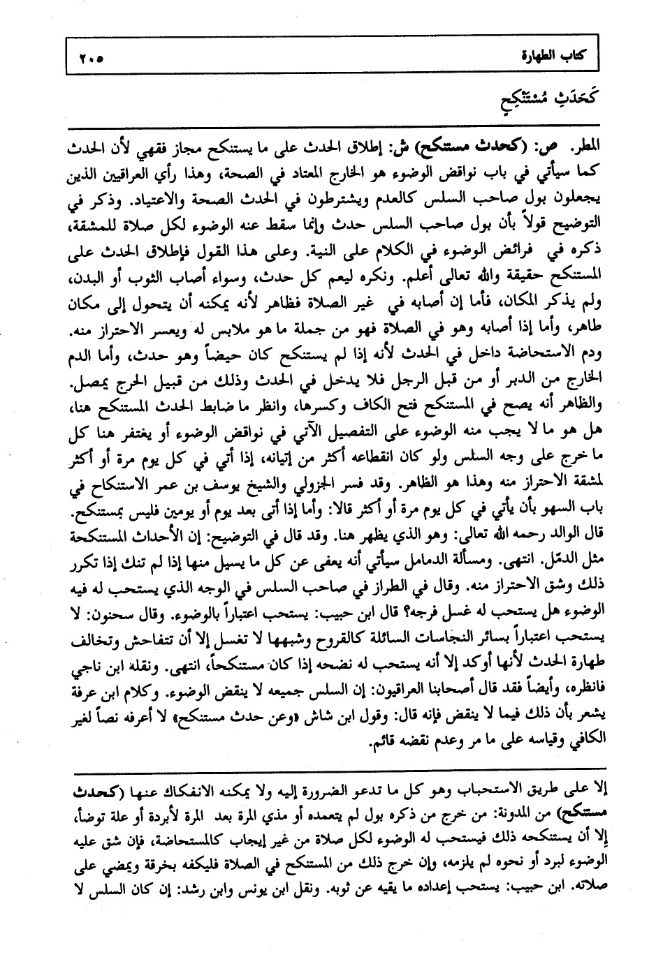 المطر ص: "كحدث مستنكح" ش: إطلاق الحدث على ما يستنكح مجاز فقهي لأن الحدث كما سيأتي في باب نواقض الوضوء هو الخارج المعتاد في الصحة وهذا رأى العراقيين الذين يجعلون بول صاحب السلس كالعدم ويشترطون في الحدث الصحة والاعتياد وذكر في التوضيح قولا بأن بول صاحب السلس حدث وإنما سقط عنه الوضوء لكل صلاة للمشقة ذكره في فرائض الوضوء في الكلام على النية وعلى هذا القول فإطلاق الحدث على المستنكح حقيقة والله تعالى أعلم. ونكره ليعم كل حدث وسوا أصاب الثوب أو البدن ولم يذكر المكان فأما إن أصابه الصلاة فظاهر لأنه يمكنه أن يتحول إلى مكان طاهر وأما إذا أصابه وهو في الصلاة فهو من جملة ما هو ملابس له ويعسر الاحتراز منه ودم الاستحاضة داخل في الحدث لأنه إذا لم يستنكح كان حيضا وهو حدث وأما الدم الخارج من الدبر أو من قبل الرجل فلا يدخل في الحدث وذلك من قبيل الحرج بمصل والظاهر أنه يصح في المستنكح فتح الكاف وكسرها وانظر ما ضابط الحدث المستنكح هنا هل هو ما لا يجب منه الوضوء على التفصيل الآتي في نواقض الوضوء أو يغتفر هنا كل ما خرج على وجه السلس ولو كان انقطاعه أكثر من إتيانه إذا أتي في كل يوم مرة أو أكثر لمشقة الاحتراز منه وهذا هو الظاهر وقد فسر الجزوري والشيخ يوسف بن عمر الاستنكاح في باب السهو بأن يأتي في كل يوم مرة أو أكثر قال وأما إذا أتى بعد يوم أو يومين فليس بمستنكح قال الوالد رحمه الله تعالى وهو الذي يظهر هنا وقد قال في التوضيح: إن الأحداث المستنكحة مثل الدمل انتهى. ومسألة الدمامل سيأتي أنه يعفى عن كل ما يسيل منها إذا لم تنك إذا تكرر ذلك وشق الاحتراز منه وقال في الطراز في صاحب السلس في الوجه الذي يستحب له فيه الوضوء هل يستحب له غسل فرجه قال بن حبيب يستحب اعتبارا بالوضوء وقال سحنون لا يستحب اعتبارا بسائر النجاسات السائلة كالقروح وشبهها لا تغسل إلا أن تتفاحش وتخالف طهارة الحدث لأنها أوكد إلا أنه يستحب له نضحه إذا كان مستنكحا انتهى. ونقله ابن ناجي فانظره وأيضا فقد قال أصحابنا العراقيون إن السلس جميعه لا ينقض الوضوء وكلام ابن عرفة يشعر بأن ذلك فيما لا ينقض فإنه قال وقول ابن شاش وعن حدث مستنكح لا أعرفه نصا لغير الكافي وقياسه على ما مر وعدم نقضه قائم.