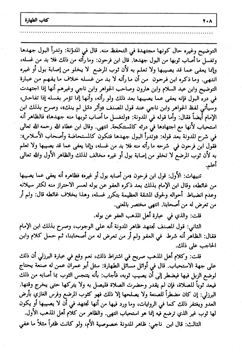 تنبيهات: الأول: قول ابن فرحون: "من أصابه بول أو غيره" فظاهره أنه يعفى عما يصيبها من غائطه وقال ابن الإمام بذلك بعد ذكره العفو عن بوله لعسر الاحتراز منه لكثر سيلانه وعدم انضباط أحواله ولحوق المشقة العظيمة بتكرر غسله وهذا بخلاف غائطه. قال: ولم أر من تعرض له من أصحابنا انتهى. مختصر بالمعنى.