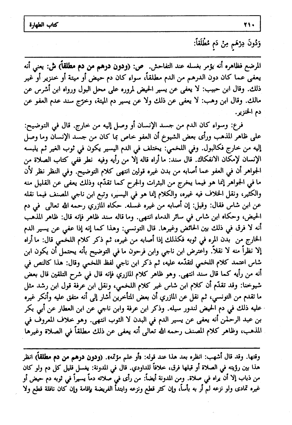 المرضع فظاهره أنه يؤمر بغسله ثم التفاحش ص: "ودون درهم من دم مطلقا" ش: يعني أنه يعفى عما كان دون الدرهم من الدم مطلقا سواء كان دم حيض أو ميتة أو خنزير أو غير ذلك وقال ابن حبيب: لا يعفى عن يسير الحيض لمروره على محل البول ورواه ابن أشرس عن مالك وقال ابن وهب: لا يعفى عن ذلك ولا عن يسير دم الميتة وخرج سند عدم العفو عن دم الخنزير.