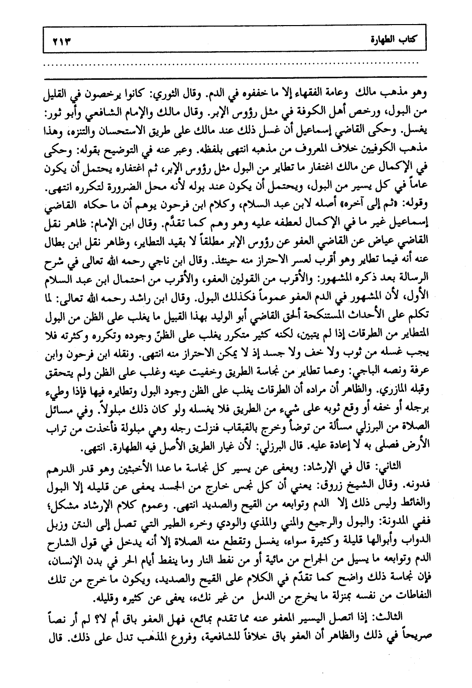 الثاني : قال في الإرشاد: ويعفى عن يسير كل نجاسة ما عدا الأخبثين وهو قدر الدرهم فدونه وقال الشيخ زروق: يعني أن كل نجس خارج من الجسد يعفى عن قليله إلا البول والغائط وليس ذلك إلا الدم وتوابعه من القيح والصديد انتهى. وعموم كلام الإرشاد مشكل ففي المدونة والبول والرجيع والمني والمذي والودي وخرء الطير التي تصل إلى النتن وزبل الدواب وأبوالها قليلة وكثيرة سواء يغسل وتقطع منه الصلاة إلا أنه يدخل في قول الشارح الدم وتوابعه ما يسيل من الجراح من مائية أو من نفط النار وما ينفط أيام الحر في بدن الإنسان فإن نجاسة ذلك واضح كما تقدم في الكلام على القيح والصديد ويكون ما خرج من تلك النفاطات من نفسه بمنزلة ما يخرج من الدمل من غير نكء يعفى عن كثيره وقليله.