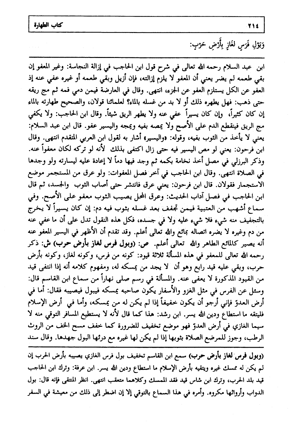 ابن عبد السلام رحمه الله تعالى في شرح قول ابن الحاجب في إزالة النجاسة: وغير المعفو إن بقي طعمه لم يضر يعني أن المعفو لا يلزم إزالته فإن أزيل وبقي طعمه أو غيره عفي عنه إذ العفو عن الكل يستلزم العفو عن الجزء انتهى. وقال في العارضة فيمن دمي فمه ثم مج ريقه حتى ذهب فهل يطهره ذلك أو لا بد من غسله بالماء لعلمائنا قولان والصحيح طهارته بالماء إن كان كثيرا وإن كان يسيرا عفي عنه ولا يطهر الريق شيئا وقال ابن الحاجب ولا يكفي مج الريق فينقطع الدم على الأصح ولا يمصه بفيه ويمجه واليسير عفو قال ابن عبد السلام: يعني لا يأخذ من الثوب بفيه وقوله واليسير أشار به لقول ابن العربي المتقدم انتهى. وقال بن فرحون يعني لو مص اليسير فيه حتى زال اكتفى بذلك لأنه لو تركه لكان معفوا عنه وذكر البرزلي في مصل أخذ نخامة بكمه ثم وجد فيها دما لا إعادة عليه ليسارته ولو وجدها في الصلاة انتهى. وقال ابن الحاجب في آخر فصل المعفوات ولو عرق من المستجمر موضع الاستجمار فقولان قال ابن فرحون: يعني عرق فانتشر حتى أصاب الثوب والجسد ثم قال ابن الحاجب في فصل آداب الحديث وعرق المحل يصيب الثوب معفو على الأصح وفي سماع أشهب من العتبية فيمن تجفف بعد غسله بثوب فيه دم إن كان يسيرا لا يخرج بالتجفيف منه شيء فلا شيء عليه ولا في جسده فكل هذه النقول تدل على أن ما عفي عنه من دم وغيره لا يضر اتصاله بمائع والله تعالى أعلم. وقد تقدم أن الأظهر في اليسير المعفو عنه أنه يصير والله تعالى أعلم. ص: "وبول فرس لغاز بأرض حرب" ش: ذكر رحمه الله تعالى للمعفو في هذه المسألة ثلاثة قيود كونه من فرس وكونه لغاز وكونه بأرض حرب وبقي عليه قيد رابع وهو أن لا يجد من يمسكه له ومفهوم كلامه أنه إذا انتفى قيد من القيود المذكورة لا يعفى عنه والمسألة في رسم صلى نهارا من سماع ابن القاسم قال وسئل عن الفرس في مثل الغزو والأسفار يكون صاحبه يمسكه فيبول فيصيبه فقال أما في أرض العدو فإني أرجو أن يكون خفيفا إذا لم يكن له من يمسكه وأما في أرض الإسلام فليتقه ما استطاع ودين الله يسر ابن رشد هذا كما قال لأنه لا يستطيع المسافر التوقي منه لا سيما الغازي في أرض العدو فهو موضع تخفيف للضرورة كما خفف مسح الخف من الروث الرطب وجوز للمرضع الصلاة بثوبها إذا لم يكن لها غيره مع درئها البول جهدها وقال سند