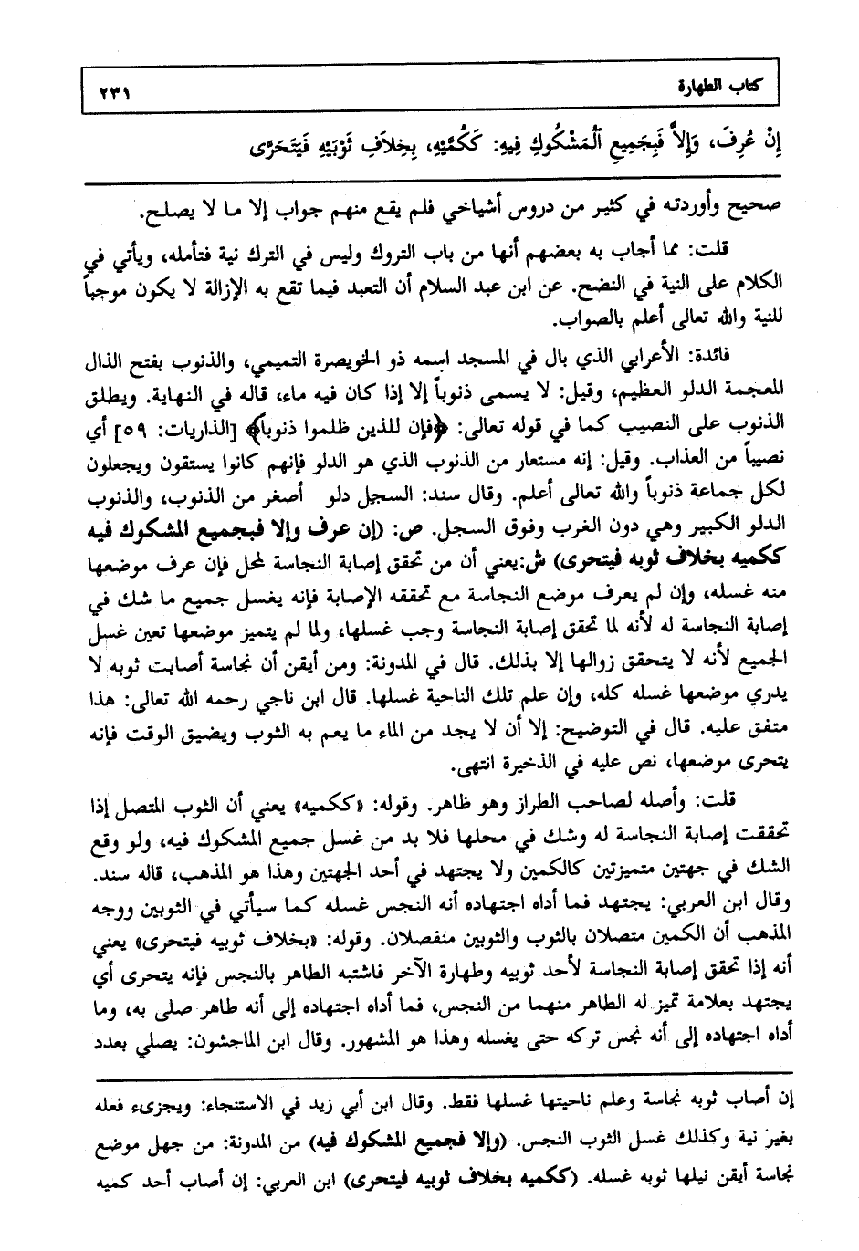 فائدة : الأعرابي الذي بال في المسجد اسمه ذو الخويصرة التميمي والذنوب بفتح الذال المعجمة الدلو العظيم وقيل لا يسمى ذنوبا إلا إذا كان فيه ماء قاله في النهاية ويطلق الذنوب على النصيب كما في قوله تعالى: {فَإِنَّ لِلَّذِينَ ظَلَمُوا ذَنُوباً} [الذريات: 59] أي نصيبا من العذاب وقيل إنه مستعار من الذنوب الذي هو الدلو فإنهم كانوا يستقون ويجعلون لكل جماعة ذنوبا والله تعالى أعلم. وقال سند السجل دلو أصغر من الذنوب والذنوب الدلو الكبير وهي دون الغرب وفوق السجل ص: "إن عرف وإلا فبجميع المشكوك فيه ككميه بخلاف ثوبه فيتحرى" ش: يعني أن من تحقق إصابة النجاسة لمحل فإن عرف موضعها منه غسله وإن لم يعرف موضع النجاسة مع تحققه الإصابة فإنه يغسل جميع ما شك في إصابة النجاسة له لأنه لما تحقق إصابة النجاسة وجب غسلها ولما لم يتميز موضعها تعين غسل الجميع لأنه لا يتحقق زوالها إلا بذلك قال في المبونة ومن أيقن أن نجاسة أصابت ثوبه لا يدري موضعها غسله كله وإن علم تلك الناحية غسلها قال ابن ناجي رحمه الله تعالى: هذا متفق عليه قال في التوضيح: إلا أن لا يجد من الماء ما يعم به الثوب ويضيق الوقت فإنه يتحرى موضعها نص عليه في الذخيرة انتهى. قلت: وأصله لصاحب الطراز وهو ظاهر وقوله: "ككميه" يعني أن الثوب المتصل إذا تحققت إصابة النجاسة له وشك في محلها فلا بد من غسل جميع المشكوك فيه ولو وقع الشك في جهتين متميزتين كالكمين ولا يجتهد في أحد الجهتين وهذا هو المذهب قاله سند وقال ابن العربي: يجتهد فما أداه اجتهاده أنه النجس غسله كما سيأتي في الثوبين ووجه المذهب أن الكمين متصلان بالثوب والثوبين منفصلان وقوله: "بخلاف ثوبيه فيتحرى" يعني أنه إذا تحقق إصابة النجاسة لأحد ثوبيه وطهارة الآخر فاشتبه الطاهر بالنجس فإنه يتحرى أي يجتهد بعلامة تميز له الطاهر منهما من النجس فما أداه اجتهاده إلى أنه طاهر صلى به وما أداه اجتهاده إلى أنه نجس تركه حتى يغسله وهذا هو المشهور وقال ابن الماجشون يصلي بعدد