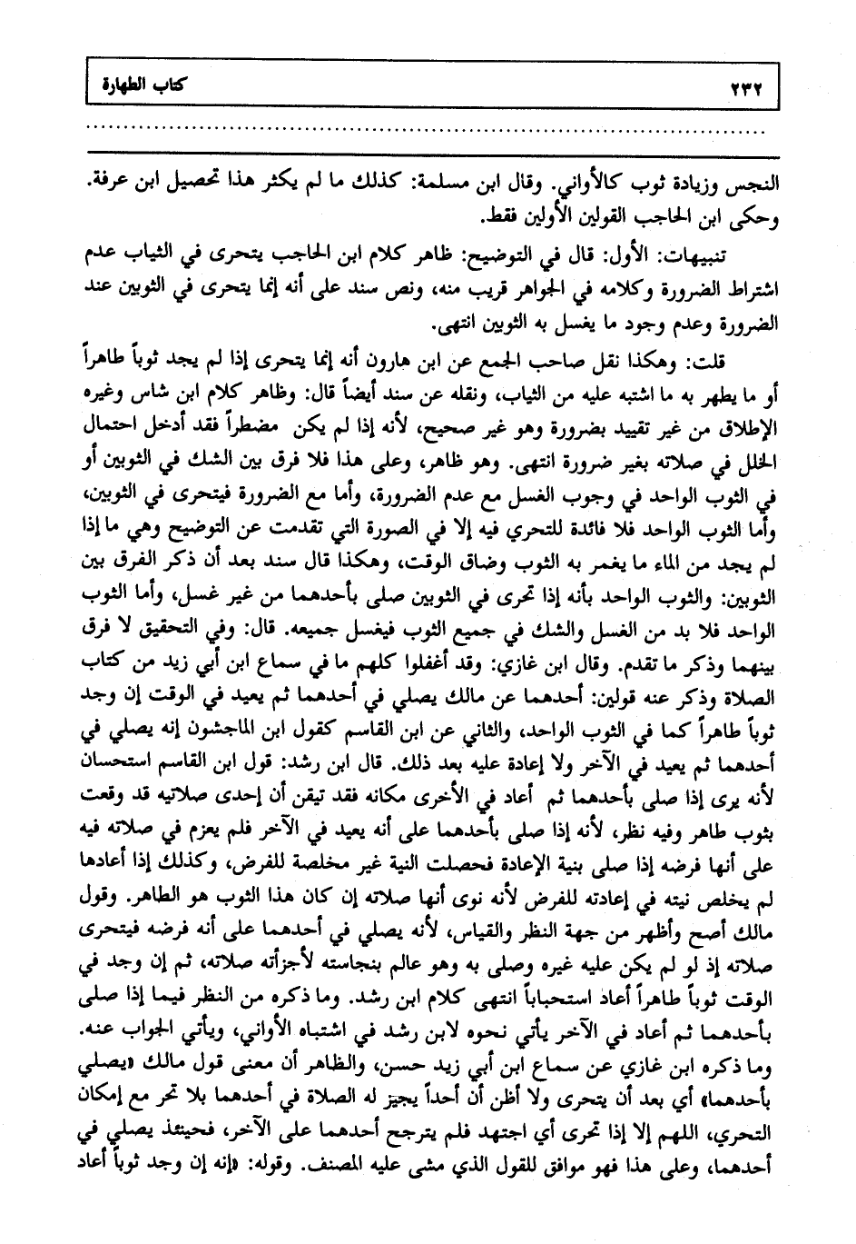 تنبيهات: الأول: قال في التوضيح: ظاهر كلام ابن الحاجب يتحرى في الثياب عدم اشتراط الضرورة وكلامه في الجواهر قريب منه ونص سند على أنه إنما يتحرى في الثوبين عند الضرورة وعدم وجود ما يغسل به الثوبين انتهى.