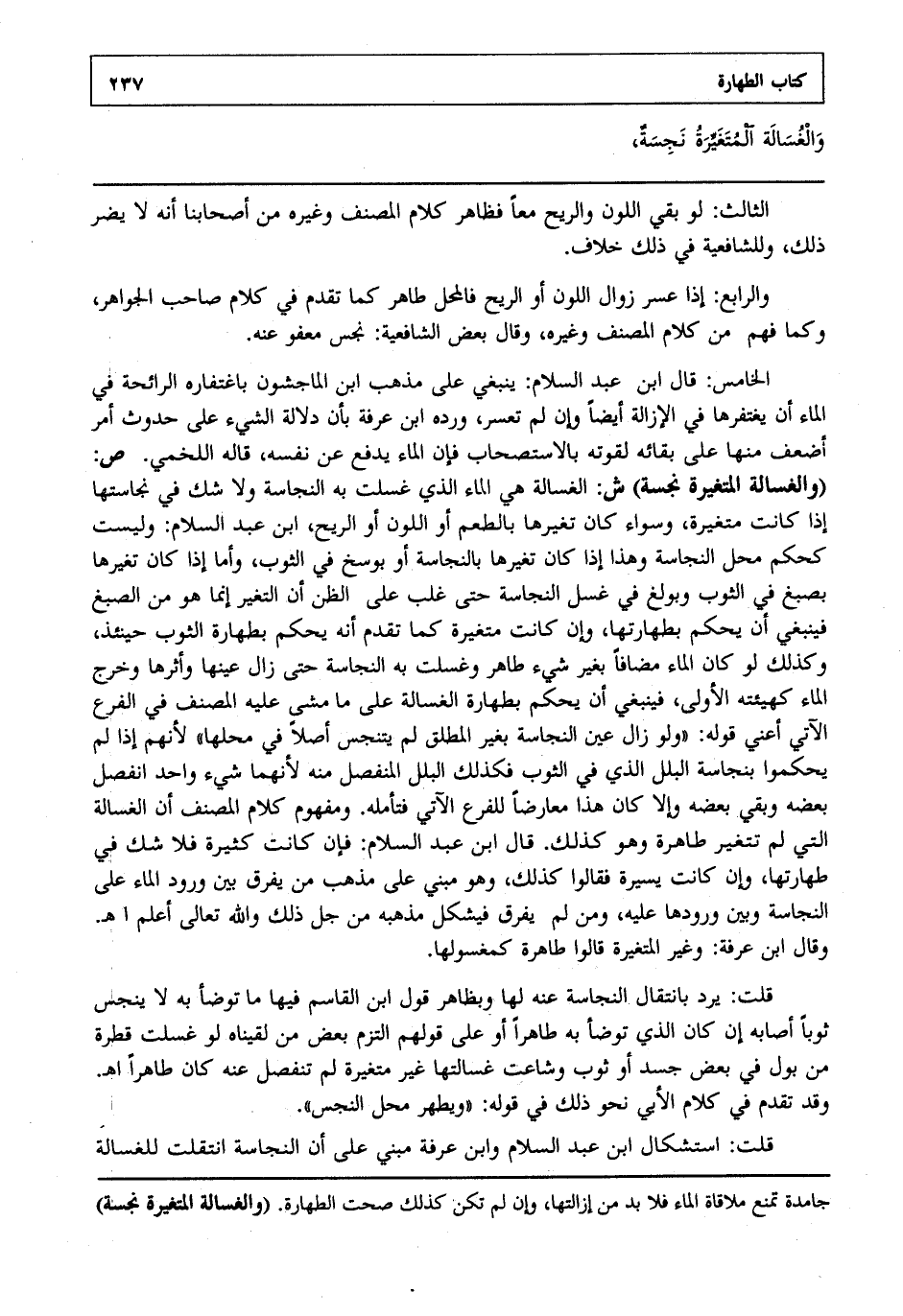قلت: يرد بانتقال النجاسة عنه لها وبظاهر قول ابن القاسم فيها ما توضأ به لا ينجس ثوبا أصابه إن كان الذي توضأ به طاهرا أو على قولهم التزم بعض من لقيناه لو غسلت قطرة من بول في بعض جسد أو ثوب وشاعت غسالتها غير متغيرة لم تنفصل عنه كان طاهرا اهـ وقد تقدم في كلام الأبي نحو ذلك في قوله ويطهر محل النجس قلت: استشكال ابن عبد السلام وابن عرفة مبني على أن النجاسة انتقلت للغسالة