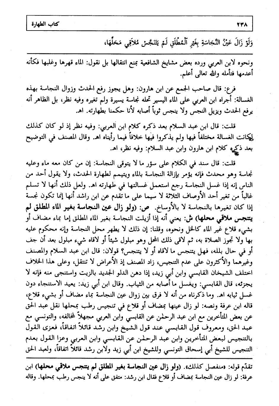 قلت: قال ابن عبد السلام بعد ذكره كلام ابن العربي: وفيه نظر إذ لو كان كذلك لكانت الغسالة مختلفا فيها ولم يذكروا فيها خلافا فيما رأيناه اهـ. وقال المصنف في التوضيح بعد ذكره كلام ابن هارون وابن عبد السلام وفيه نظر اهـ.