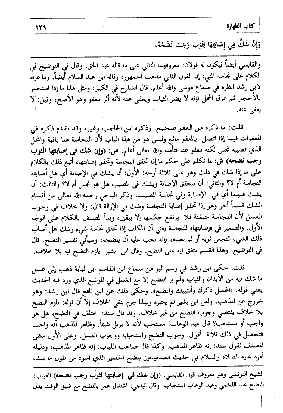 قلت: ما ذكره من العفو صحيح وذكره ابن الحاجب وغيره وقد تقدم ذكره في المعفوات فيما إذا اتصل بالمعفو مائع وليس هو من هذا الباب لأن النجاسة هنا باقية والمحل الذي تصيبه نجس لكنه معفو عنه فتأمله والله تعالى أعلم. ص: "وإن شك في إصابتها الثوب وجب نضحه" ش: لما تكلم على حكم ما إذا تحقق النجاسة وتحقق إصابتها أتبع ذلك بالكلام على ما إذا شك في ذلك وهو على ثلاثة أوجه الأول أن يشك في الإصابة أي هل أصابته النجاسة أم لا والثاني أن يتحقق الإصابة ويشك في المصيب هل هو نجس أم لا والثالث أن يشك فيهما أي في الإصابة وفي نجاسة المصيب وذكر الباجي رحمه الله تعالى من أقسام الشك قسما آخر وهو إذا تحقق إصابة النجاسة وشك في الإزالة قال ولا خلاف في وجوب الغسل لأن النجاسة متيقنة فلا يرتفع حكمها إلا بيقين وبدأ المصنف بالكلام على الوجه الأول والضمير في إصابتها للنجاسة يعني أن المكلف إذا تحقق نجاسة شيء وشك هل أصاب ذلك الشيء النجس ثوبه أو لم يصبه فإنه يجب عليه أن ينضحه وسيأتي تفسير النصح قال في التوضيح: وهذا القسم متفق فيه على النضح وقال ابن بشير: يلزم النضح فيه بلا خلاف.