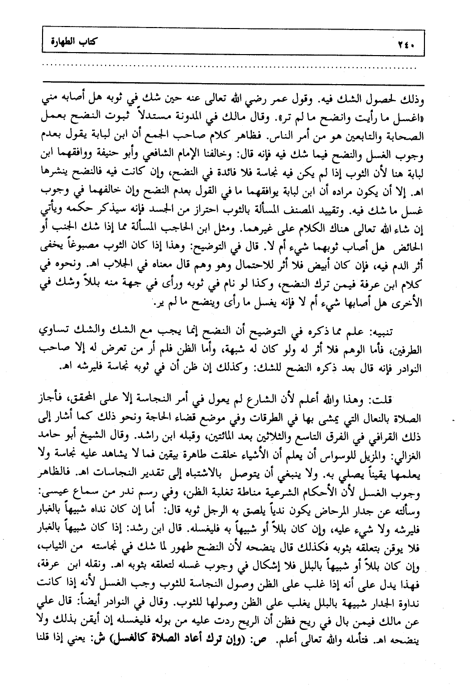 تنبيه : علم مما ذكره في التوضيح أن النضح إنما يجب مع الشك والشك تساوي الطرفين فأما الوهم فلا أثر له ولو كان له شبهة وأما الظن فلم أر من تعرض له إلا صاحب النوادر فإنه قال بعد ذكره النضح للشك وكذلك إن ظن أن في ثوبه نجاسة فليرشه اهـ.