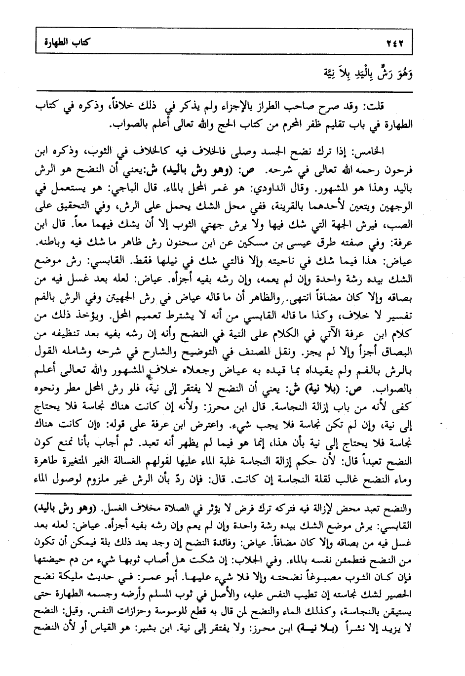 الخامس : إذا ترك نضح الجسد وصلى فالخلاف فيه كالخلاف في الثوب وذكره ابن فرحون رحمه الله تعالى في شرحه ص: "وهو رش باليد" ش: يعني أن النضح هو الرش باليد وهذا هو المشهور وقال الداودي هو غمر المحل بالماء قال الباجي هو يستعمل في الوجهين ويتعين لأحدهما بالقرينة ففي محل الشك يحمل على الرش وفي التحقيق على الصب فيرش الجهة التي شك فيها ولا يرش جهتي الثوب إلا أن يشك فيهما معا قال ابن عرفة: وفي صفته طرق عيسى بن مسكين عن ابن سحنون رش ظاهر ما شك فيه وباطنه عياض هذا فيما شك في ناحيته وإلا فالتي شك في نيلها فقط القابسي رش موضع الشك بيده رشة واحدة وإن لم يعمه وإن رشه بفيه أجزأه عياض لعله بعد غسل فيه من بصاقه وإلا كان مضافا انتهى. والظاهر أن ما قاله عياض في رش الجهيتن وفي الرش بالفم تفسير لا خلاف وكذا ما قاله القابسي من أنه لا يشترط تعميم المحل ويؤخذ ذلك من كلام ابن عرفة الآتي في الكلام على النية في النضح وأنه إن رشه بفيه بعد تنظيفه من البصاق أجزأ وإلا لم يجز ونقل المصنف في التوضيح والشارح في شرحه وشامله القول بالرش بالفم ولم يقيداه بما قيده به عياض وجعلاه خلاف المشهور والله تعالى أعلم. بالصواب ص: "بلا نية" ش: يعني أن النضح لا يفتقر إلى نية فلو رش المحل مطر ونحوه كفى لأنه من باب إزالة النجاسة قال ابن محرز: ولأنه إن كانت هناك نجاسة فلا يحتاج إلى نية وإن لم تكن نجاسة فلا يجب شيء واعترض ابن عرفة على قوله إن كانت هناك نجاسة فلا يحتاج إلى نية بأن هذا إنما هو فيما لم يظهر أنه تعبد ثم أجاب بأنا نمنع كونا النضح تعبدا قال لأن حكم إزالة النجاسة غلبة الماء عليها لقولهم الغسالة الغير المتغيرة طاهرة وماء النضح غالب لقلة النجاسة إن كانت قال فإن رد بأن الرش غيرملزوم لوصول الماء