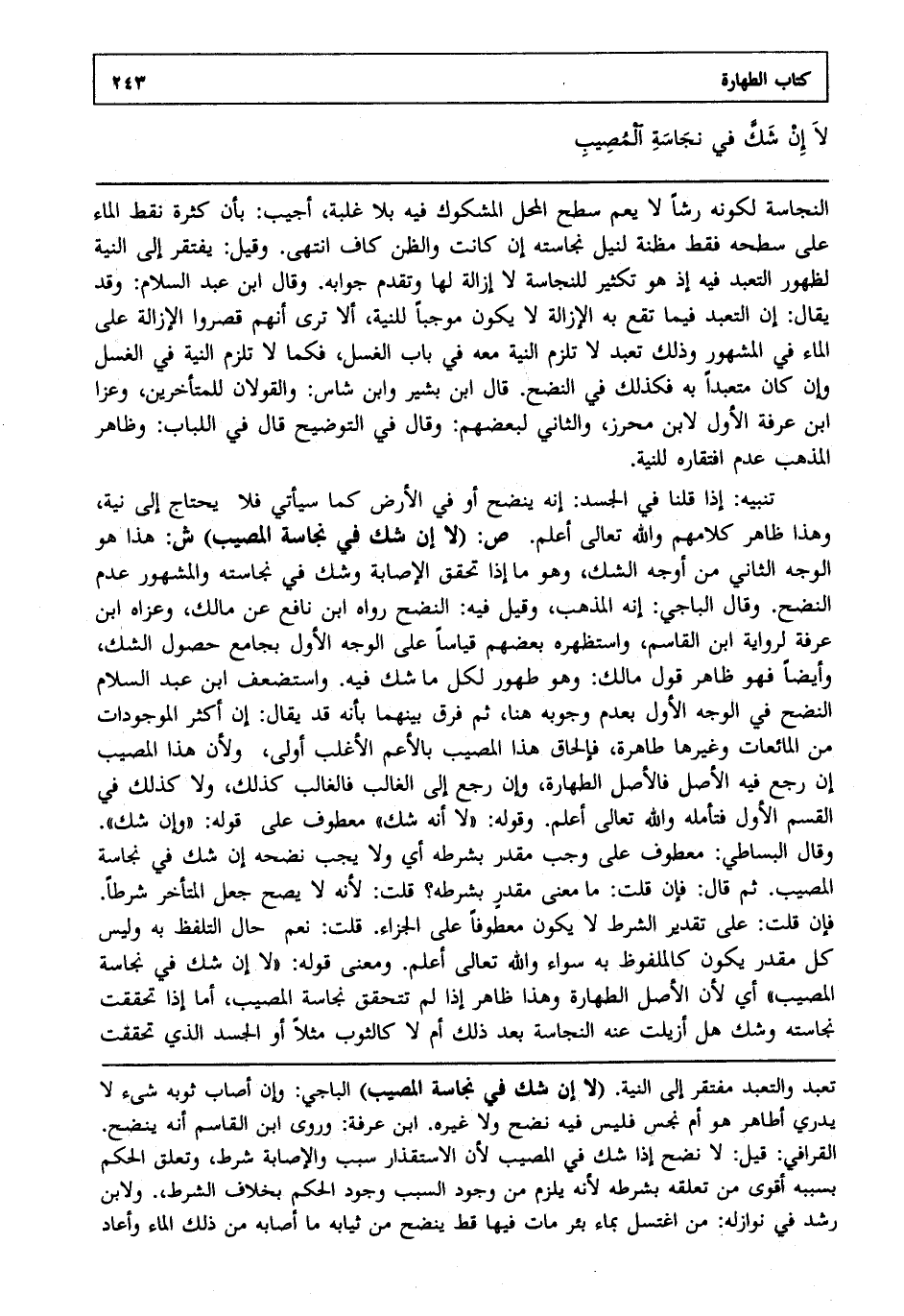 تنبيه : إذا قلنا في الجسد إنه ينضح أو في الأرض كما سيأتي فلا يحتاج إلى نية وهذا ظاهر كلامهم والله تعالى أعلم. ص: "لا إن شك في نجاسة المصيب" ش: هذا هو الوجه الثاني من أوجه الشك وهو ما إذا تحقق الإصابة وشك في نجاسته والمشهور عدم النضح وقال الباجي إنه المذهب وقيل فيه النضح رواه ابن نافع عن مالك وعزاه ابن عرفة لرواية ابن القاسم واستظهره بعضهم قياسا على الوجه الأول بجامع حصول الشك وأيضا فهو ظاهر قول مالك وهو طهور لكل ما شك فيه واستضعف ابن عبد السلام النضح في الوجه الأول بعدم وجوبه هنا ثم فرق بينهما بأنه قد يقال إن أكثر الموجودات من المائعات وغيرها طاهرة فإلحاق هذا المصيب بالأعم الأغلب أولى ولأن هذ المصيب إن رجع فيه الأصل فالأصل الطهارة وإن رجع إلى الغالب فالغالب كذلك ولا كذلك في القسم الأول فتأمله والله تعالى أعلم. وقوله لا أنه شك معطوف على قوله وإن شك وقال البساطي معطوف على وجب مقدر بشرطه أي ولا يجب نضحه إن شك في نجاسة المصيب ثم قال فإن قلت: ما معنى مقدر بشرطه قلت: لأنه لا يصح جعل المتأخر شرطا فإن قلت: على تقدير الشرط لا يكون معطوفا على الجزاء قلت: نعم حال التلفظ به وليس كل مقدر يكون كالملفوظ به سواء والله تعالى أعلم. ومعنى قوله لا إن شك في نجاسة المصيب أي لأن الأصل الطهارة وهذا ظاهر إذا لم تتحقق نجاسة المصيب أما إذا تحققت نجاسته وشك هل أزيلت عنه النجاسة بعد ذلك أم لا كالثوب مثلا أو الجسد الذي تحققت