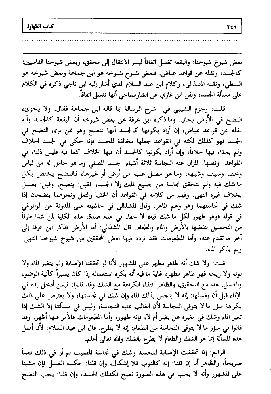 قلت: وجزم الشيبي في شرح الرسالة بما قاله ابن جماعة فقال ولا يجزئ النضح في الأرض بحال وما ذكره ابن عرفة عن بعض شيوخه أن البقعة كالجسد وأنه نقله عن قواعد عياض إن أراد بكونها كالجسد أنها تنضح وهو ممن يرى النضح في الجسد فهو كذلك لكنه في القواعد جعلها مخالفة للجسد فإنه حكى في الجسد الخلاف ولم يحك فيها خلافا وإن أراد بكونها كالجسد أن فيها الخلاف كما فيه فليس ذلك في القواعد ونصها المزال عنه النجاسة ثلاثة أشياء جسد المصلي وما هو حامل له من لباس وخف وسيف وشبهه وما هو مصل عليه من أرض أو غيرها فالنضح يختص بكل ما شك فيه ولم تتحقق نجاسة من جميع ذلك إلا الجسد فقيل ينضح وقيل يغسل بخلاف غيره انتهى. وفهم من كلامه في القواعد أن الخف والنعل ونحوهما ينضحان إذا شك في نجاستهما وهو وهم ظاهر وقال المشذالي في حاشيته على المدونة عن الوانوغي في قوله وهو طهور لكل ما شك فيه لا خفاء في عدم صدق هذه الكلية لمن شذا طرفا من التحصيل لنقضها بالأرض والماء والطعام قال المشذالي أما الأرض فذكر ابن عرفة إلى آخر ما تقدم عنه وأما المطعومات فقد تردد فيها بعض المحققين من شيوخ شيوخنا انتهى. ولم يذكر الماء.