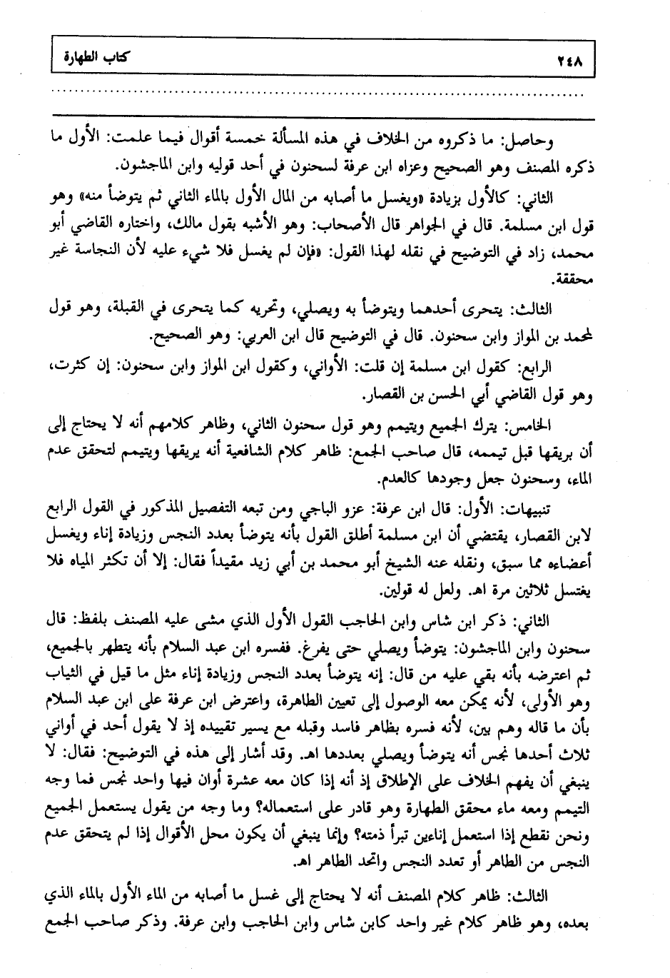 تنبيهات: الأول: قال ابن عرفة: عزو الباجي ومن تبعه التفصيل المذكور في القول الرابع لابن القصار يقتضي أن ابن مسلمة أطلق القول بأنه يتوضأ بعدد النجس وزيادة إناء ويغسل أعضاءه مما سبق ونقله عنه الشيخ أبو محمد بن أبي زيد مقيدا فقال إلا أن تكثر المياه فلا يغتسل ثلاثين مرة اهـ ولعل له قولين.