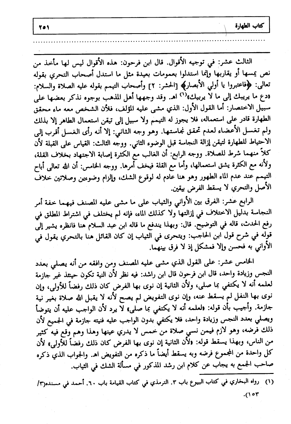 الثالث عشر: في توجيه الأقوال قال ابن فرحون: هذه الأقوال ليس لها مأخذ من نص يمسها أو يقاربها وإنما استدلوا بعمومات بعيدة مثل ما استدل أصحاب التحري بقوله تعالى: {فَاعْتَبِرُوا يَا أُولِي الأَبْصَارِ} [الحشر: 2] وأصحاب التيمم بقوله عليه الصلاة والسلام: "دع ما يريبك إلى ما لا يربيك" 1 اهـ. وقد وجهها أهل المذهب بوجوه نذكر بعضها على سبيل الاختصار أما القول الأول الذي مشى عليه المؤلف فلأن الشخص معه ماء محقق الطهارة قادر على استعماله فلا يجوز له التيمم ولا سبيل إلى تيقن استعمال الطاهر إلا بذلك ولم تغسل الأعضاء لعدم تحقق نجاستها وهو وجه الثاني إلا أنه رأى الغسل أقرب إلى الاحتياط للطهارة لتيقن إزالة النجاسة قبل الوضوء الثاني ووجه الثالث القياس على القبلة لأن كلا منهما شرط للصلاة ووجه الرابع أن الغالب مع الكثرة إصابة الاجتهاد بخلاف القلة ولأنه مع الكثرة يشق استعمالها وأما مع القلة فيخف أمرها ووجه الخامس أن الله تعالى أباح التيمم عند عدم الماء الطهور وهو هنا عادم له لوقوع الشك وإلزام وضوءين وصلاتين خلاف الأصل والتحري لا يسقط الفرض بيقين.