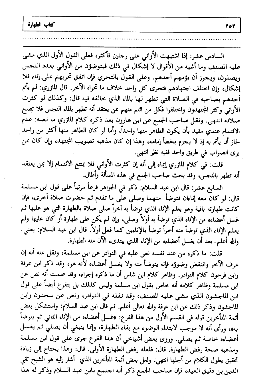 السابع عشر: قال ابن عبد السلام: ذكر في الجواهر فرعا مرتبا على قول ابن مسلمة قال لو كان معه إناءان فتوضأ منهما وصلى على ما تقدم ثم حضرت صلاة أخرى فإن كانت طهارته باقية وهو يعلم الإناء الذي توضأ به آخرا صلى صلاة بالطهارة التي هو عليها ثم غسل أعضاءه من الإناء الذي توضأ به أولا وصلى وإن لم يكن على طهارة أو كان عليها ولم يعلم الإناء الذي توضأ منه آخرا توضأ بالإناءين كما فعل أولا قال ابن عبد السلام: يعني والله أعلم. بعد أن يغسل أعضاءه من الإناء الذي يبتدئ الآن منه الطهارة.