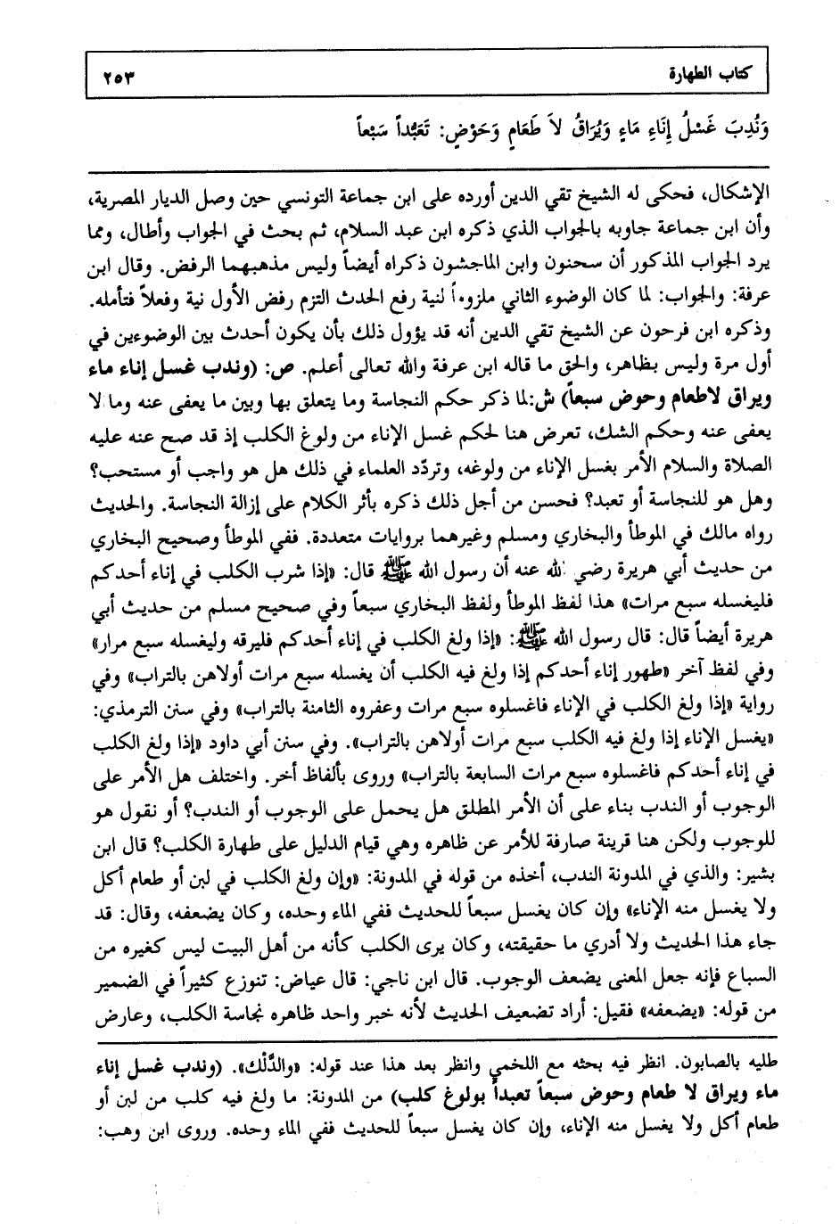 الإشكال فحكى له الشيخ تقي الدين أورده على ابن جماعة التونسي حين وصل الديار المصرية وأن ابن جماعة جاوبه بالجواب الذي ذكره ابن عبد السلام ثم بحث في الجواب وأطال ومما يرد الجواب المذكور أن سحنون وابن الماجشون ذكراه أيضا وليس مذهبهما الرفض وقال ابن عرفة: والجواب لما كان الوضوء الثاني ملزوما لنية رفع الحدث التزم رفض الأول نية وفعلا فتأمله وذكره ابن فرحون عن الشيخ تقي الدين أنه قد يؤول ذلك بأن يكون أحدث بين الوضوءين في أول مرة وليس بظاهر والحق ما قاله ابن عرفة والله تعالى أعلم. ص: "وندب غسل إناء ماء ويراق لاطعام وحوض سبعا" ش: لما ذكر حكم النجاسة وما يتعلق بها وبين ما يعفى عنه وما لا يعفى عنه وحكم الشك تعرض هنا لحكم غسل الإناء من ولوغ الكلب إذ قد صح عنه عليه الصلاة والسلام الأمر بغسل الإناء من ولوغه وتردد العلماء في ذلك هل هو واجب أو مستحب وهل هو للنجاسة أو تعبد فحسن من أجل ذلك ذكره بأثر الكلام على إزالة النجاسة والحديث رواه مالك في الموطأ والبخاري ومسلم وغيرهما بروايات متعددة ففي الموطأ وصحيح البخاري من حديث أبي هريرة رضي الله عنه أن رسول الله صلى الله عليه وسلم قال: "إذا شرب الكلب في إناء أحدكم فليغسله سبع مرات" هذا لفظ الموطأ ولفظ البخاري سبعا وفي صحيح مسلم من حديث أبي هريرة أيضا قال: قال رسول الله صلى الله عليه وسلم: " إذا ولغ الكلب في إناء أحدكم فليرقه وليغسله سبع مرار" وفي لفظ آخر: "طهور إناء أحدكم إذا ولغ فيه الكلب أن يغسله سبع مرات أولاهن بالتراب" وفي رواية: " إذا ولغ الكلب في الإناء فاغسلوه سبع مرات وعفروه الثامنة بالتراب" وفي سنن الترمذي: "يغسل الإناء إذا ولغ فيه الكلب سبع مرات أولاهن بالتراب" وفي سنن أبي داود: "إذا ولغ الكلب في إناء أحدكم فاغسلوه سبع مرات السابعة بالتراب" وروى بألفاظ أخر واختلف هل الأمر على الوجوب أو الندب بناء على أن الأمر المطلق هل يحمل على الوجوب أو الندب أو نقول هو للوجوب ولكن هنا قرينة صارفة للأمر عن ظاهره وهي قيام الدليل على طهارة الكلب قال ابن بشير: والذي في المدونة الندب أخذه من قوله في المدونة وإن ولغ الكلب في لبن أو طعام أكل ولا يغسل منه الإناء وإن كان يغسل سبعا للحديث ففي الماء وحده وكان يضعفه وقال قد جاء هذا الحديث ولا أدري ما حقيقته وكان يرى الكلب كأنه من أهل البيت ليس كغيره من السباع فإنه جعل المعنى يضعف الوجوب قال بن ناجي قال عياض: تنوزع كثيرا في الضمير من قوله: "يضعفه" فقيل: أراد تضعيف الحديث لأنه خبر واحد ظاهره نجاسة الكلب وعارض