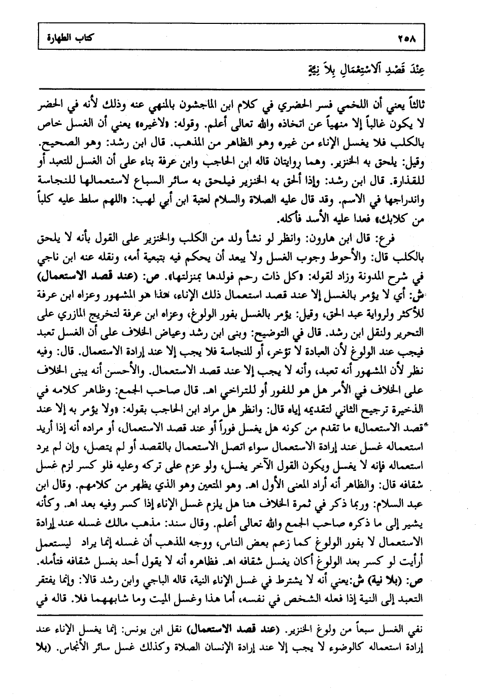 فرع : قال ابن هارون: وانظر لو نشأ ولد من الكلب والخنزير على القول بأنه لا يلحق بالكلب قال والأحوط وجوب الغسل ولا يبعد أن يحكم فيه بتبعية أمه ونقله عنه ابن ناجي في شرح المدونة وزاد لقوله كل ذات رحم فولدها بمنزلتها ص: "عند قصد الاستعمال" ش: أي لا يؤمر بالغسل إلا عند قصد استعمال ذلك الإناء هذا هو المشهور وعزاه ابن عرفة للأكثر ولرواية عبد الحق وقيل يؤمر بالغسل بفور الولوغ وعزاه ابن عرفة لتخريج المازري على التحرير ولنقل ابن رشد قال في التوضيح: وبنى ابن رشد وعياض الخلاف على أن الغسل تعبد فيجب عند الولوغ لأن العبادة لا تؤخر أو للنجاسة فلا يجب إلا عند إرادة الاستعمال قال وفيه نظر لأن المشهور أنه تعبد وأنه لا يجب إلا عند قصد الاستعمال والأحسن أنه يبنى الخلاف على الخلاف في الأمر هل هو للفور أو للتراخي اه قال صاحب الجمع: وظاهر كلامه في الذخيرة ترجيح الثاني لتقديمه إياه قال وانظر هل مراد ابن الحاجب بقوله ولا يؤمر به إلا عند قصد الاستعمال ما تقدم من كونه هل يغسل فورا أو ثم قصد الاستعمال أو مراده أنه إذا أريد استعماله غسل عند إرادة الاستعمال سواء اتصل الاستعمال بالقصد أو لم يتصل وإن لم يرد استعماله فإنه لا يغسل ويكون القول الآخر يغسل ولو عزم على تركه وعليه فلو كسر لزم غسل شقافه قال والظاهر أنه أراد المعنى الأول اه وهو المتعين وهو الذي يظهر من كلامهم وقال ابن عبد السلام: وربما ذكر في ثمرة الخلاف هنا هل يلزم غسل الإناء إذا كسر وفيه بعد اه وكأنه يشير إلى ما ذكره صاحب الجمع والله تعالى أعلم. وقال سند مذهب مالك غسله ثم إرادة الاستعمال لا بفور الولوغ كما زعم بعض الناس ووجه المذهب أن غسله إنما يراد ليستعمل أرأيت لو كسر بعد الولوغ أكان يغسل شقافه اه فظاهره أنه لا يقول أحد بغسل شقافه فتأمله ص: "بلا نية" ش: يعني أنه لا يشترط في غسل الإناء النية قاله الباجي وابن رشد قالا وإنما يفتقر التعبد إلى النيةإذا فعله الشخص في نفسه أما هذا وغسل الميت وما شابههما فلا قاله في